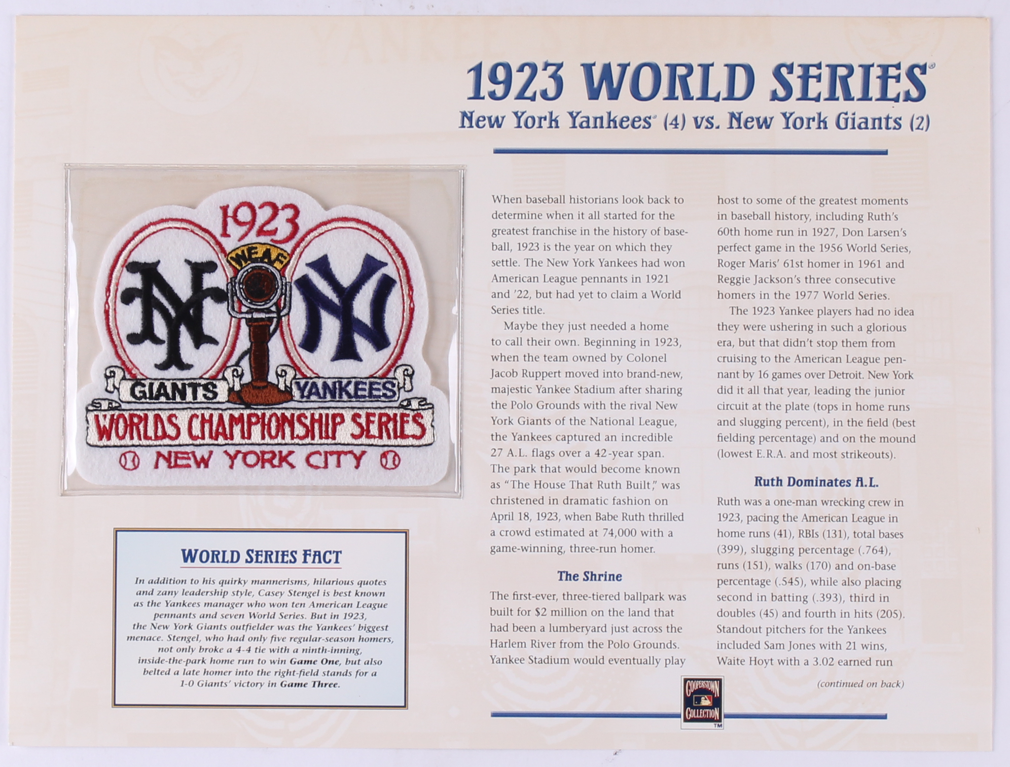 1923 World Series Patch With 9x12 Yankees Vs Giants Scorecard