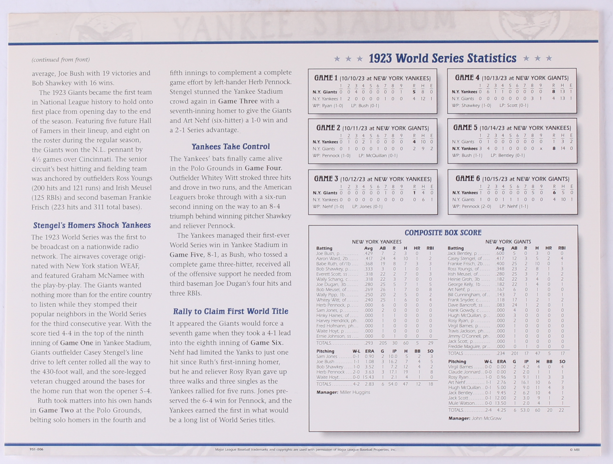 In the 1923 World Series, the New York Yankees beat the New York Giants in six games. This would be the first of the Yankees' 27 World Series championships. The series was not played in a 2–3–2 format: as with the previous two Series (where both clubs had shared the Polo Grounds) the home field alternated each game, though this time it involved switching ballparks, as the first Yankee Stadium had opened this season.