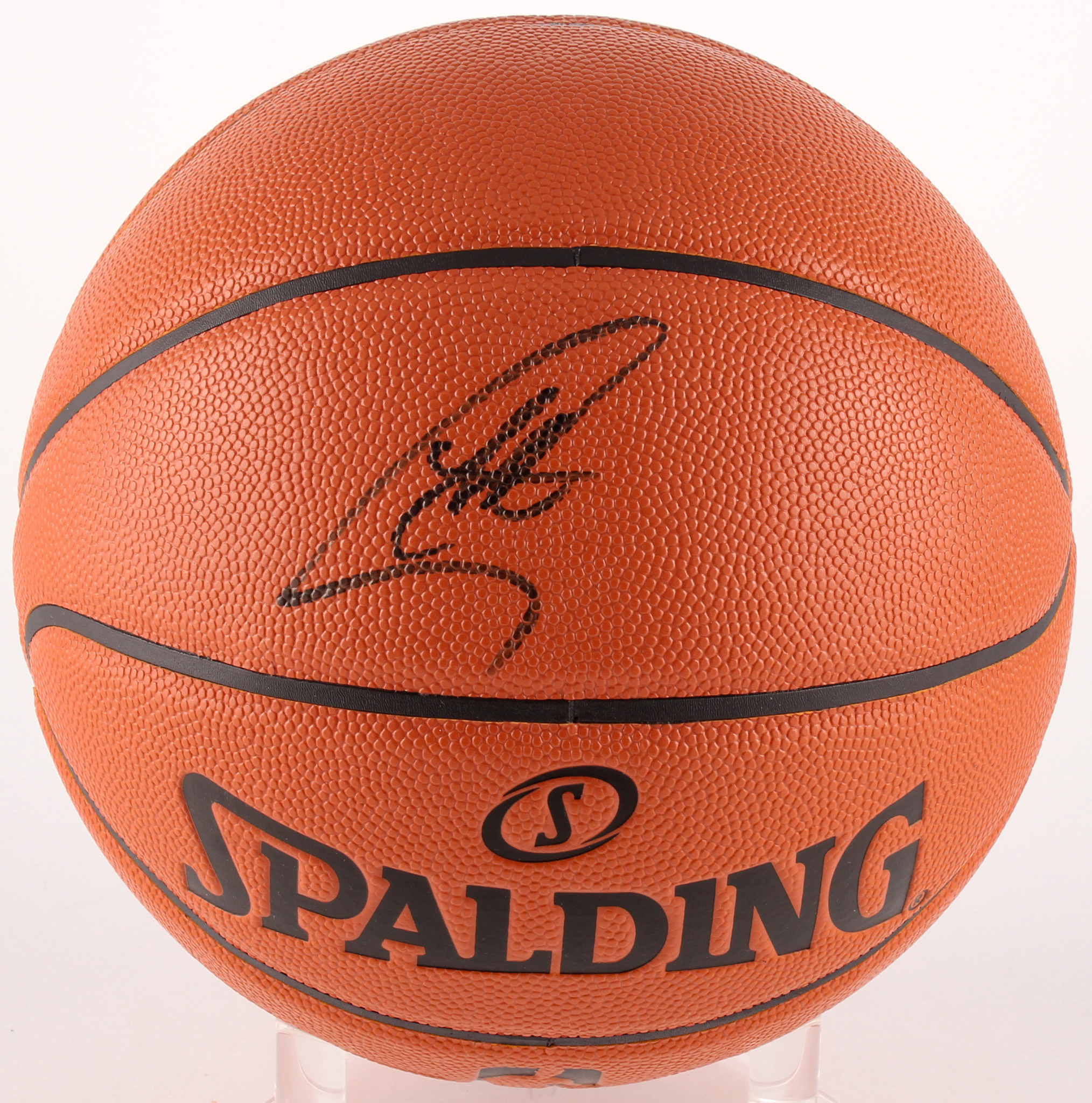 Spalding NBA Game Ball Series basketball has been hand-signed in black felt-tip pen by Stephen Curry (Warriors).