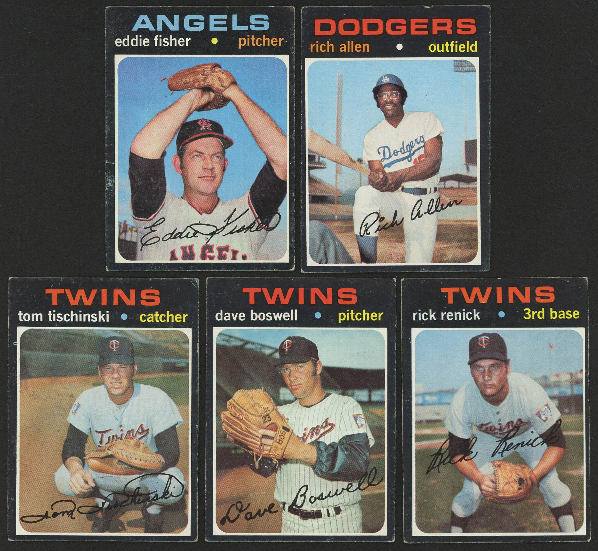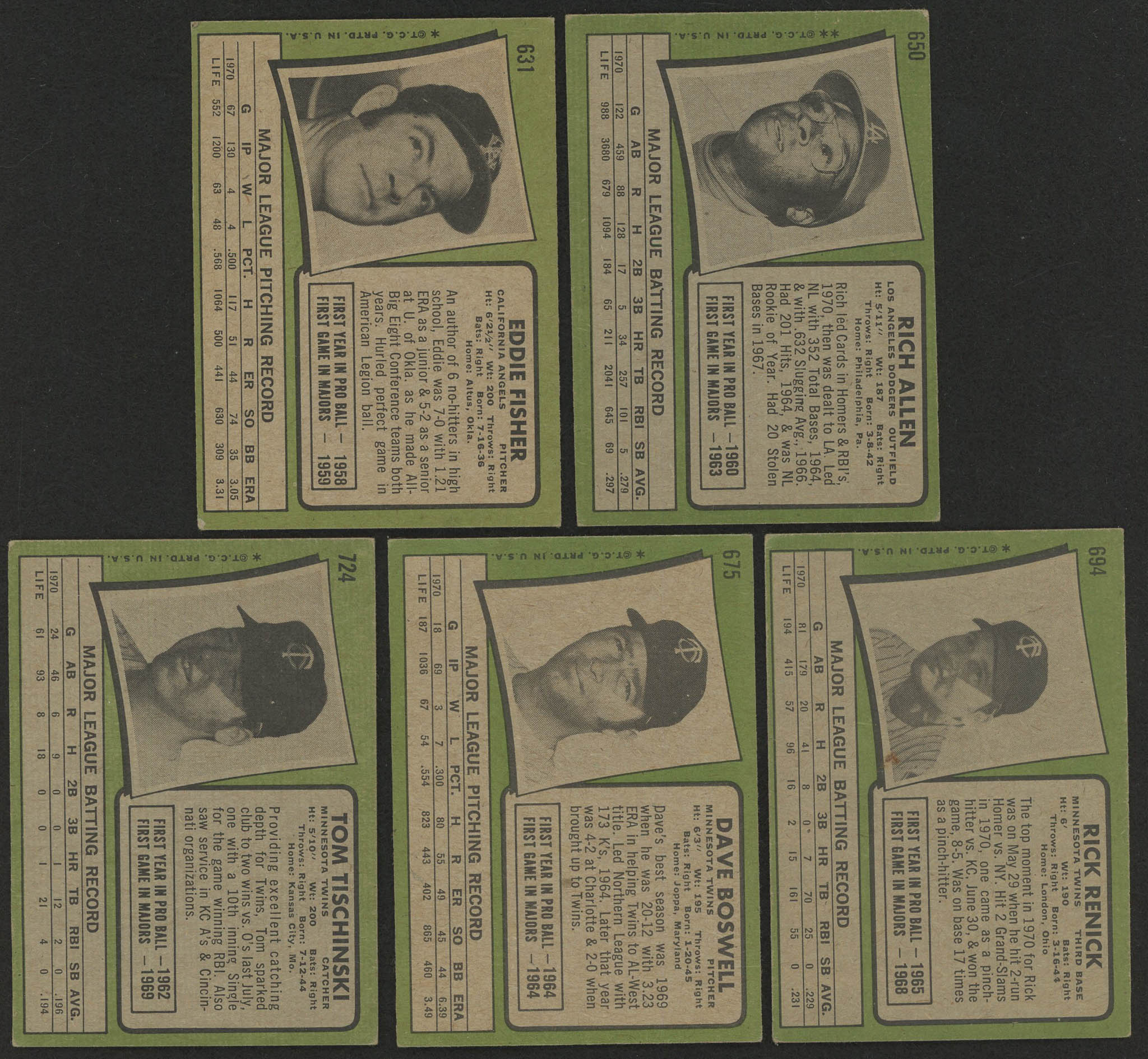 Lot of (5) 1971 Topps Baseball Cards with (1) #650 Rich Allen, (1) #631 Eddie Fisher, (1) #694 Rick Renick, (1) #675 Dave Boswell, (1) #724 Tom Tischinski