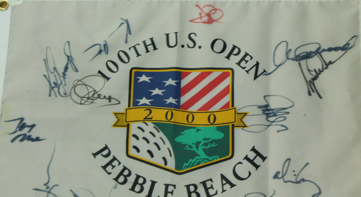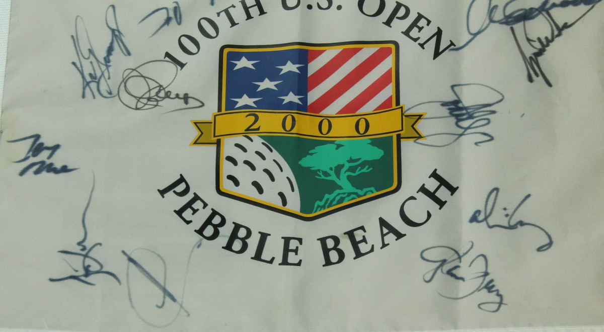 Custom framed piece measures 29" x 33" in size and is highlighted by a 2000 Pebble Beach golf pin flag hand-signed by (12). Autographs include: Tiger Woods, Clint Eastwood, John Elway, Ken Griffey Jr., Alice Cooper, Kevin Costner, Glenn Frey, David DuVal, Jerry Rice, and more.