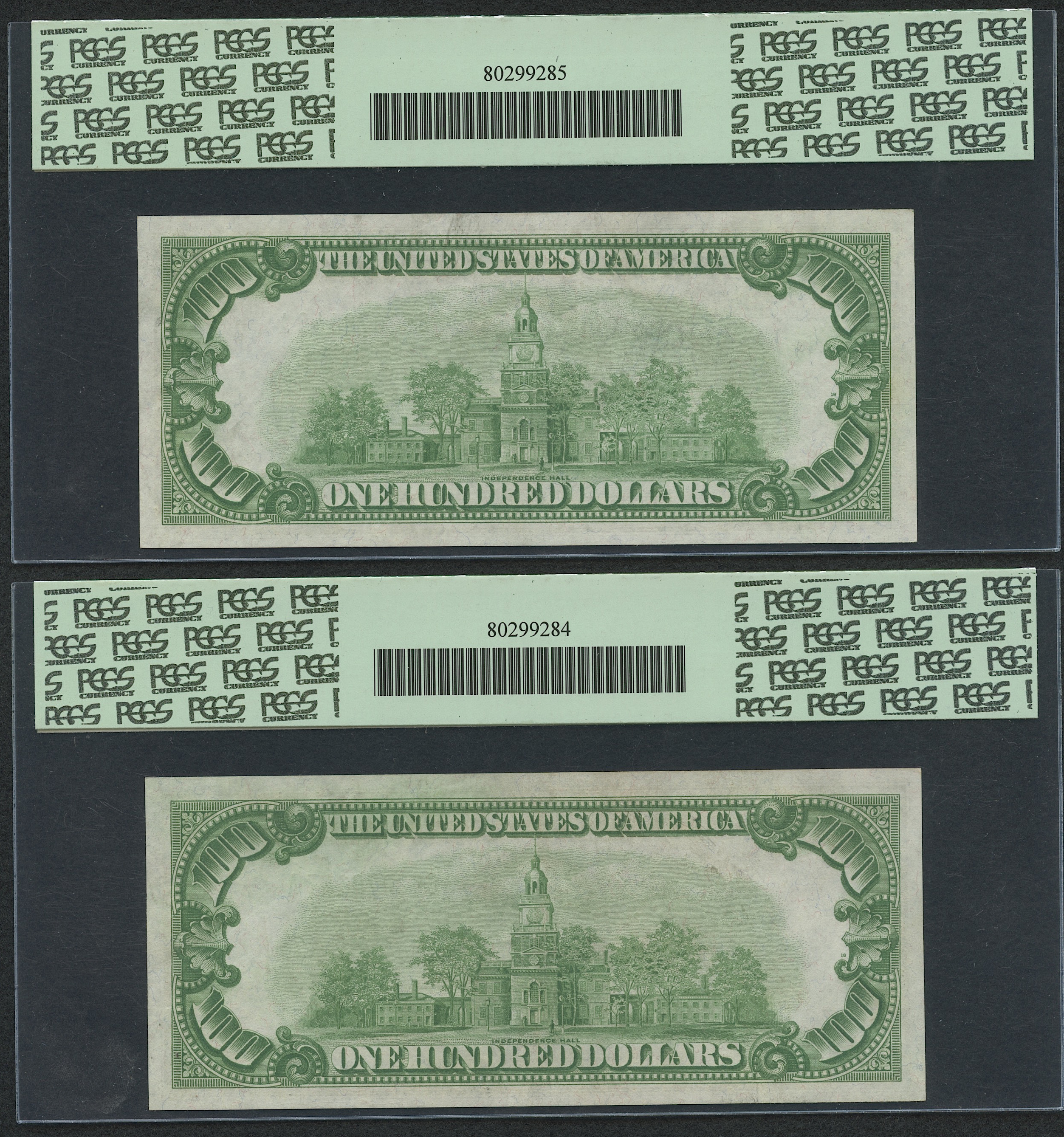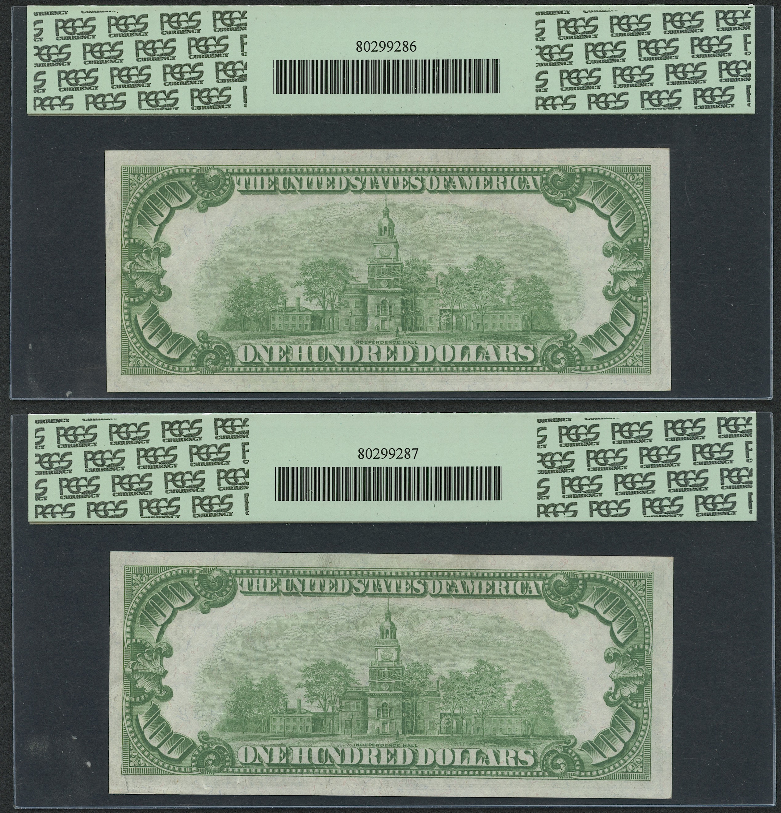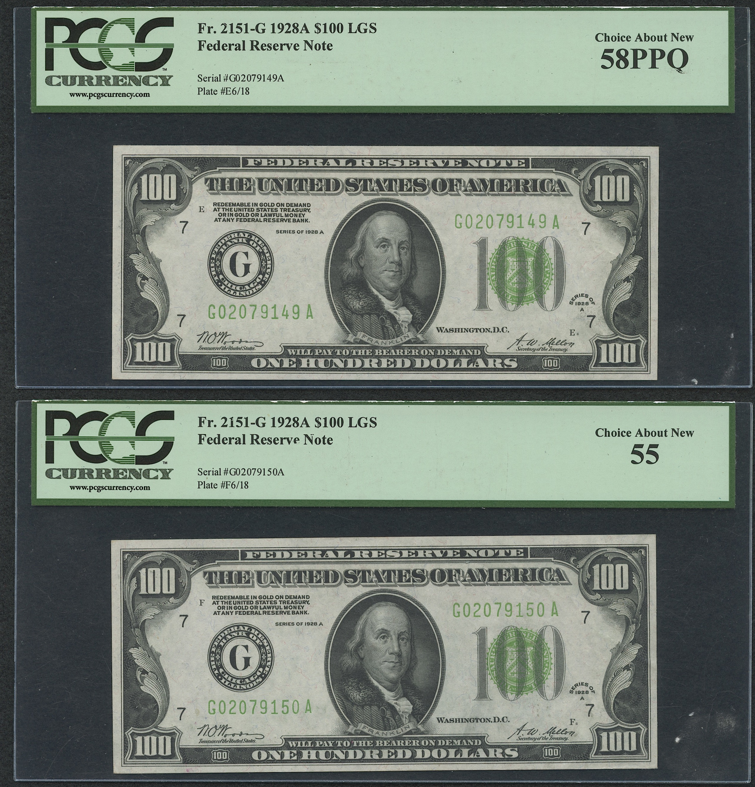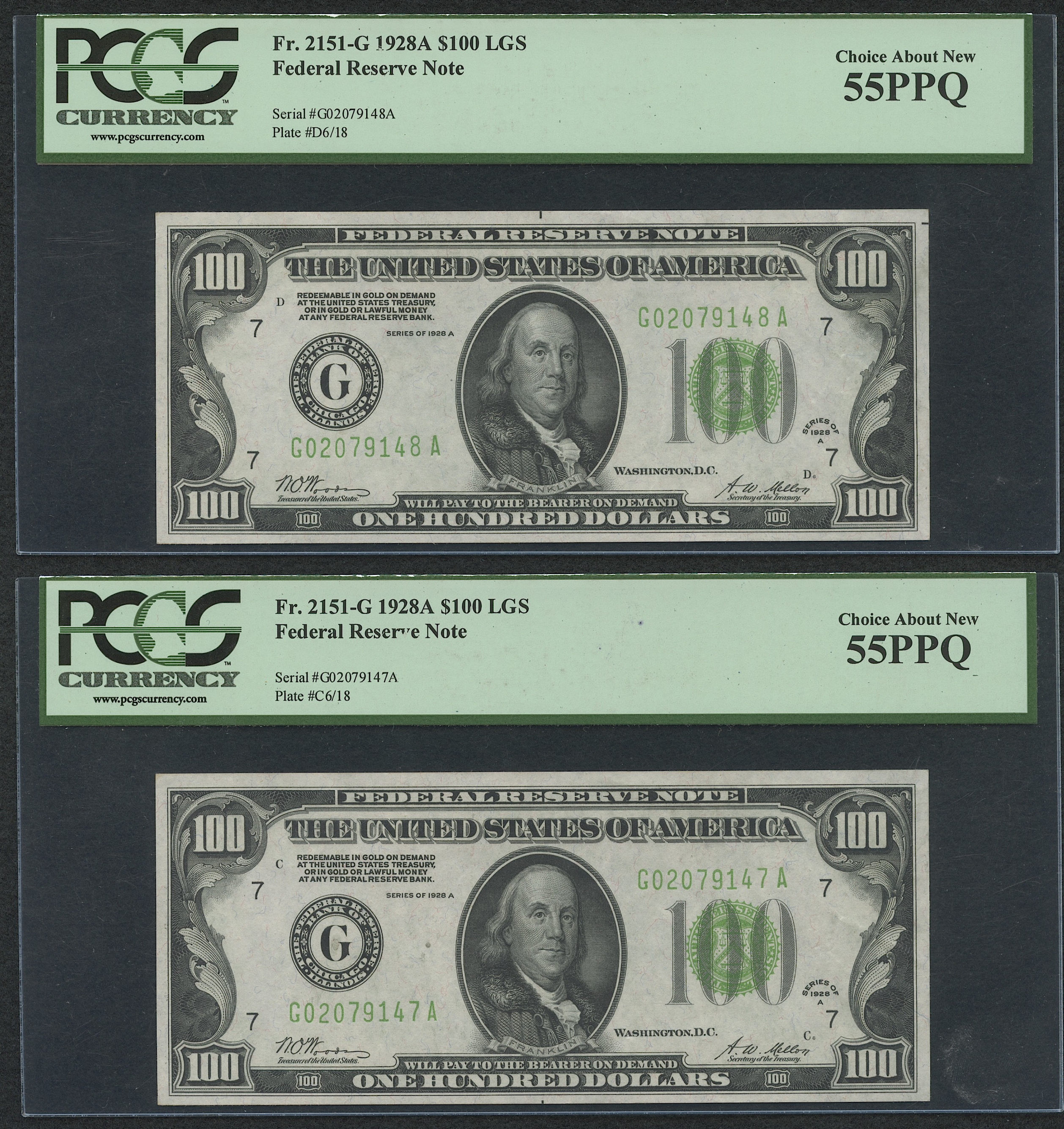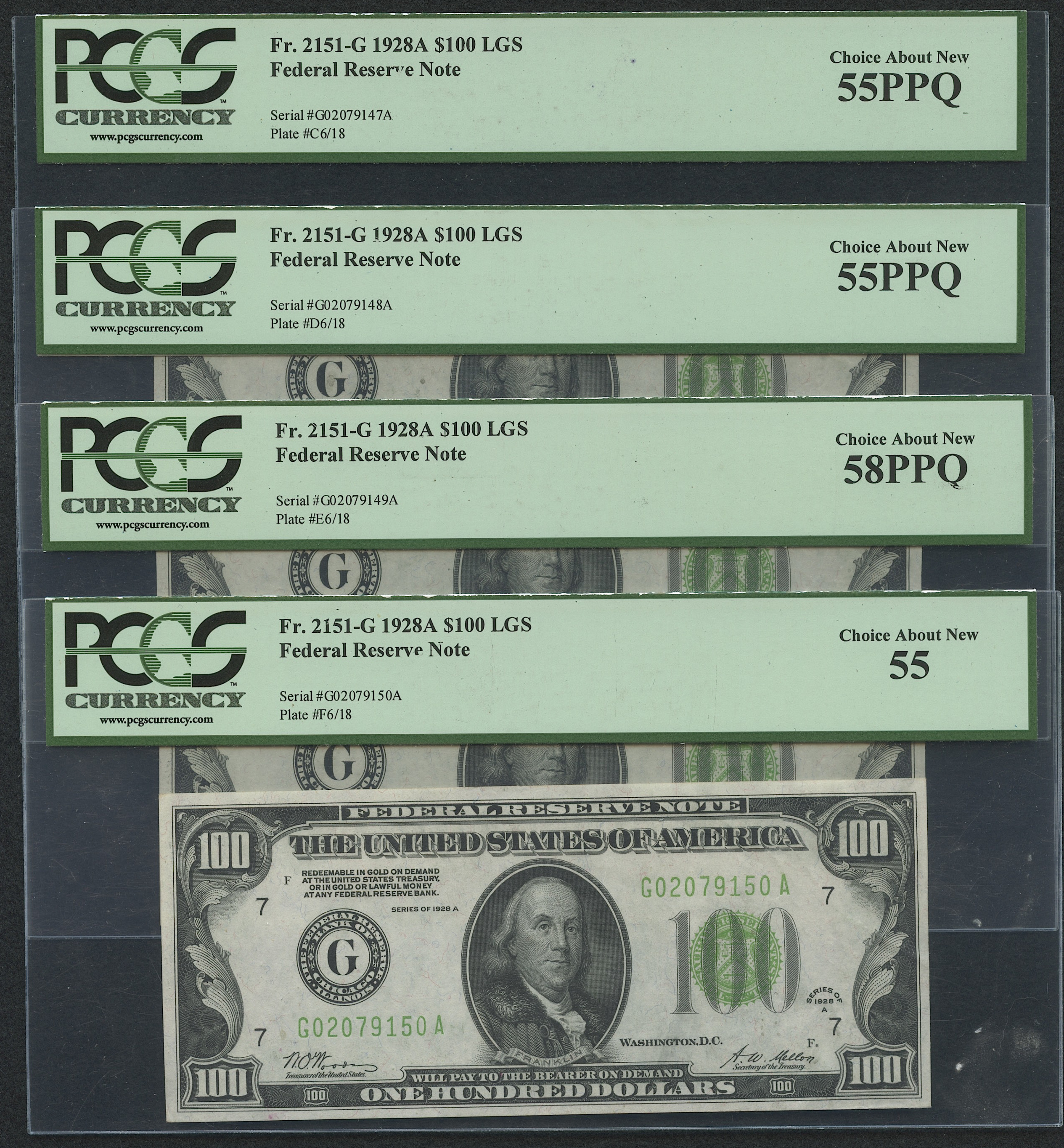 Lot of (4) 1928-A $100 One Hundred Dollars U.S. Federal Reserve Notes with Consecutive Serial Numbers (PCGS 55)