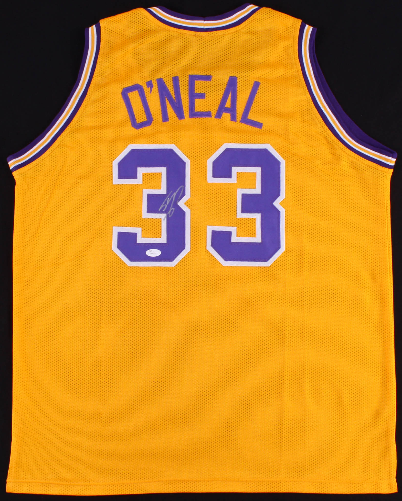 Custom on-court style jersey. Everything is sewn on, size XL. Hand-signed in silver paint pen by Shaquille O'Neal (HOF).