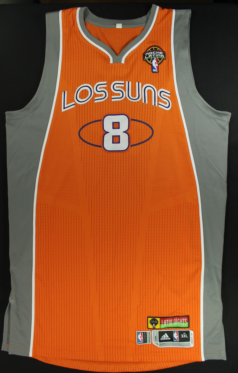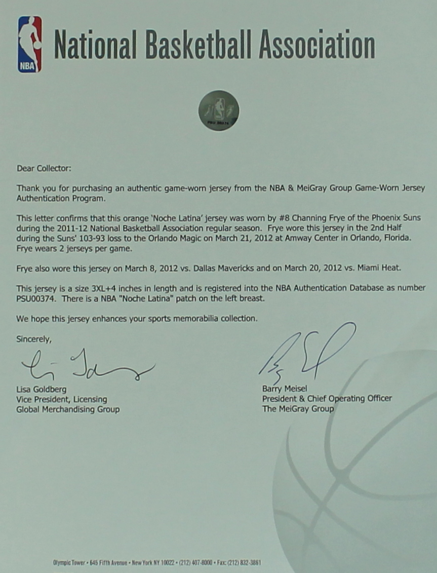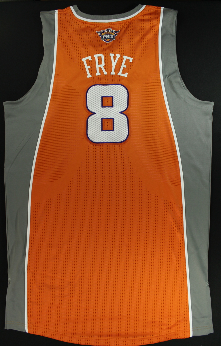 The Orange Phoenix Suns road jersey was worn during the 2nd half of the Suns's 103-93 loss to the Orlando Magic on March 21, 2012 at Amway Center in Orlando, FL. Frye wears 2 jerseys per game. The jersey was also worn on March 8, 2012 vs the Dallas Mavericks and March 20, 2012 vs the Miami Heat. The jersey is size 3xL +4. The jersey includes an official NBA LOA for authenticity purposes.