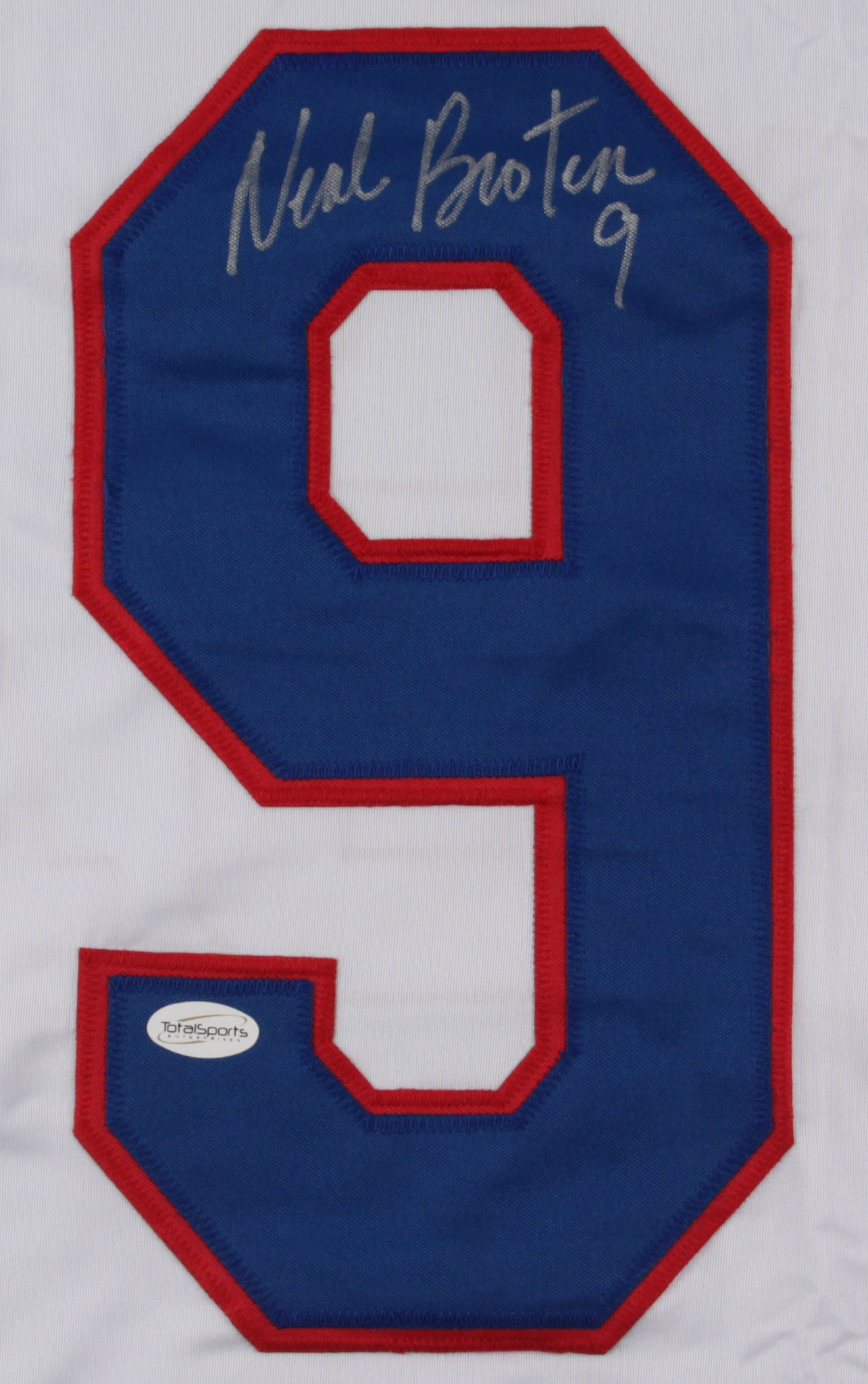 Custom on-ice style jersey. Everything is sewn on, size XL. Hand signed in silver paint pen by Neal Broten.