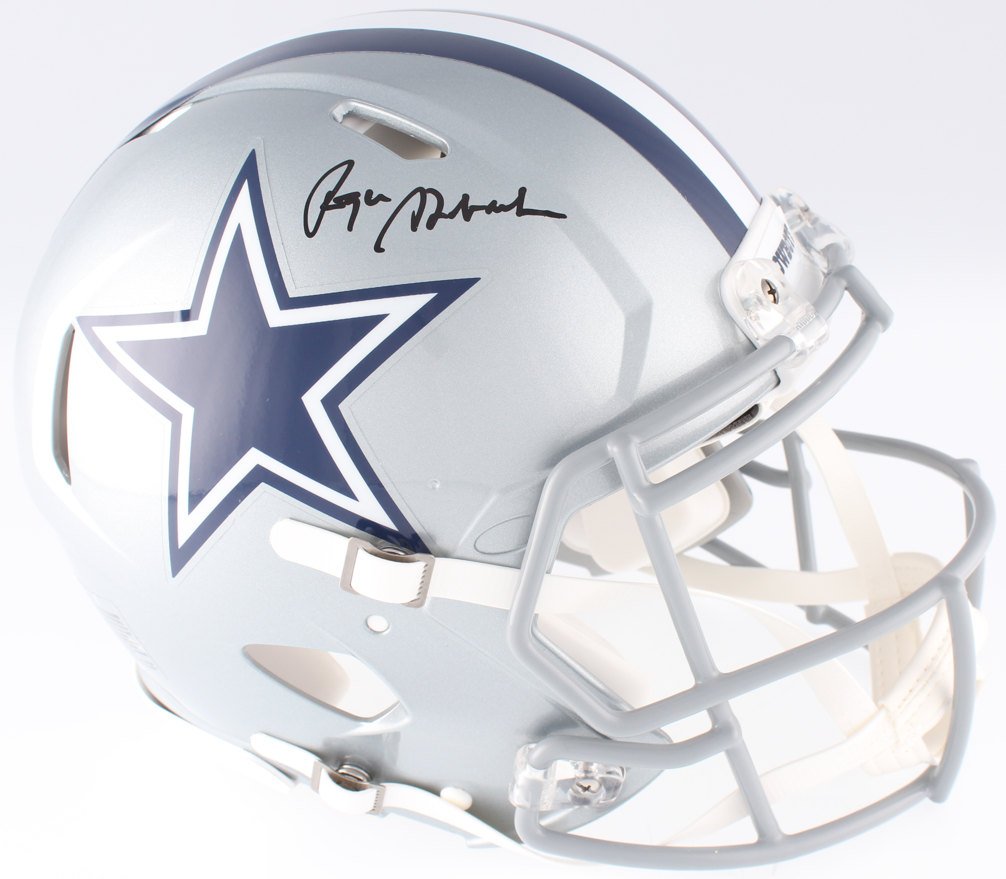 Riddell Dallas Cowboys full-size authentic on-field Speed helmet. Hand-signed in black felt-tip pen by Roger Staubach (HOF).