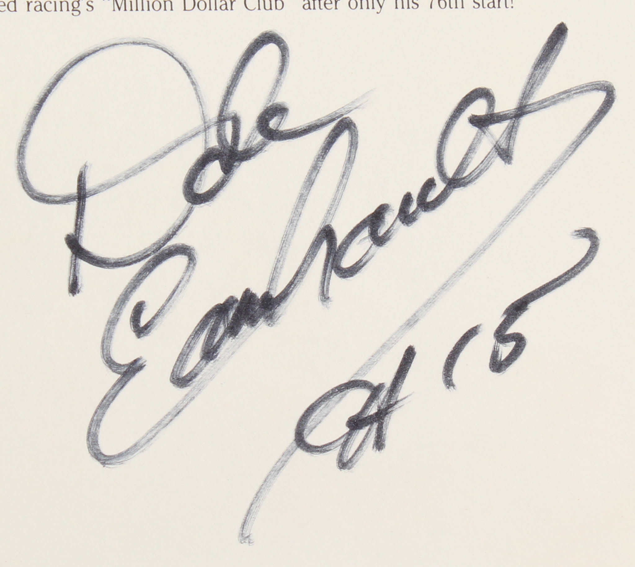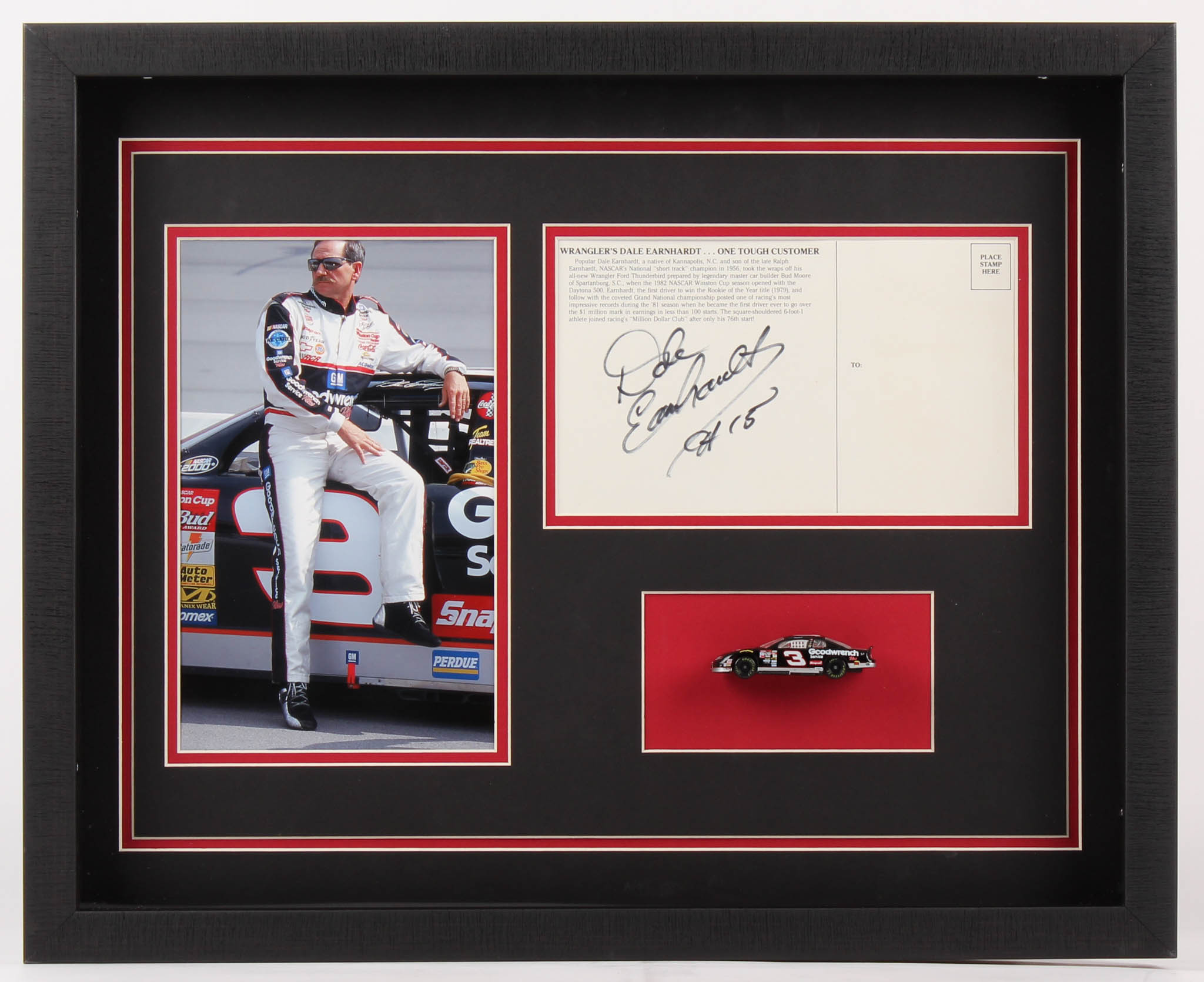 Custom framed shadowbox photo display measures approximately 17.75" x 21.75" x 2" in size, and features a postcard that has been hand-signed and inscribed in black felt-tip pen by Dale Earnhardt Sr. Please note, frame shows signs of handling.
