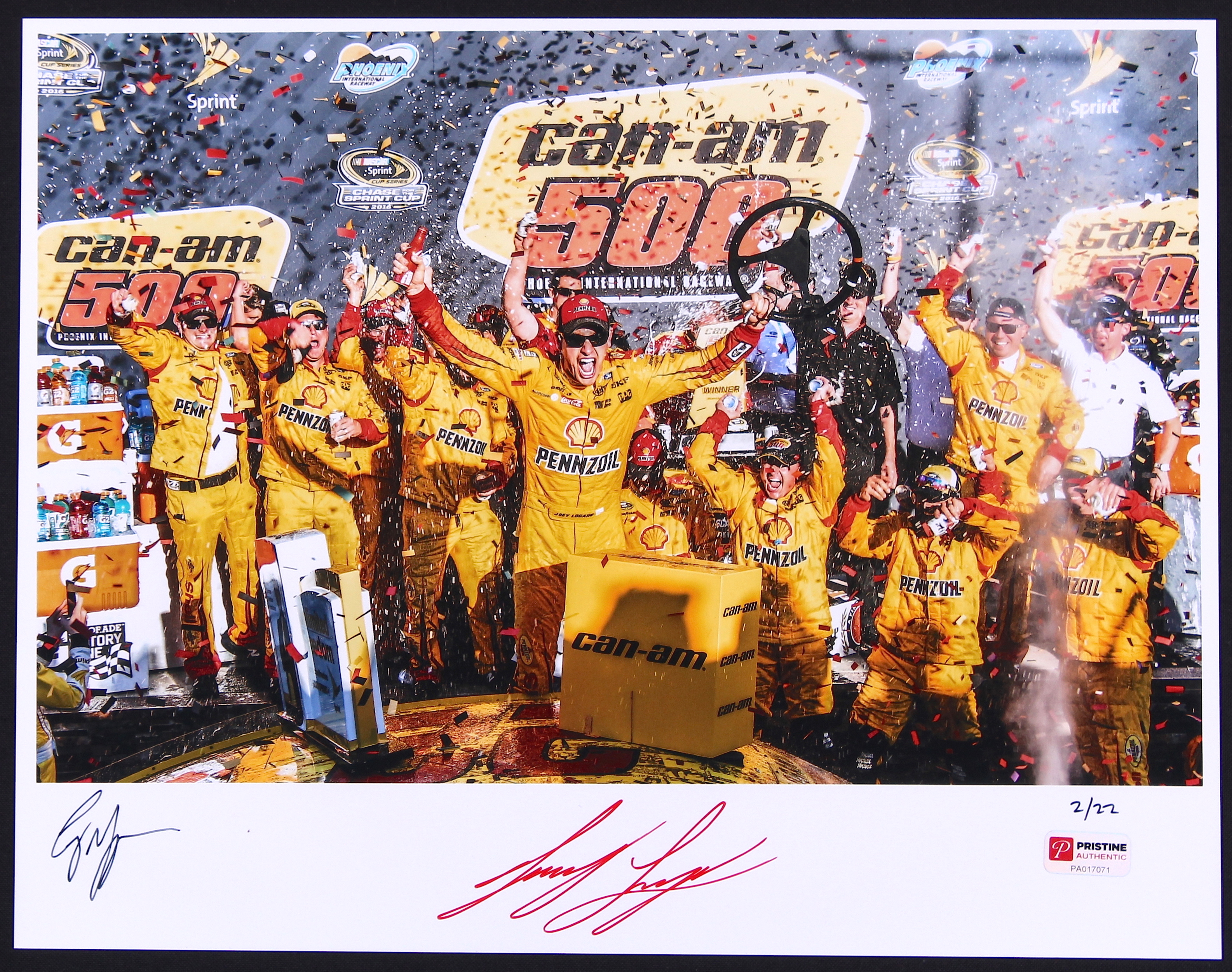 Photo measures 11" x 14" in size and is hand-signed in red felt tip pen by NASCAR superstar Joey Logano. The photo is also hand-signed by talented photographer Corey Grapevine and is limited edition and hand-numbered #/22.