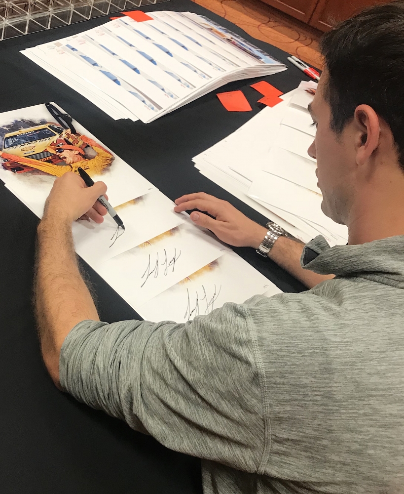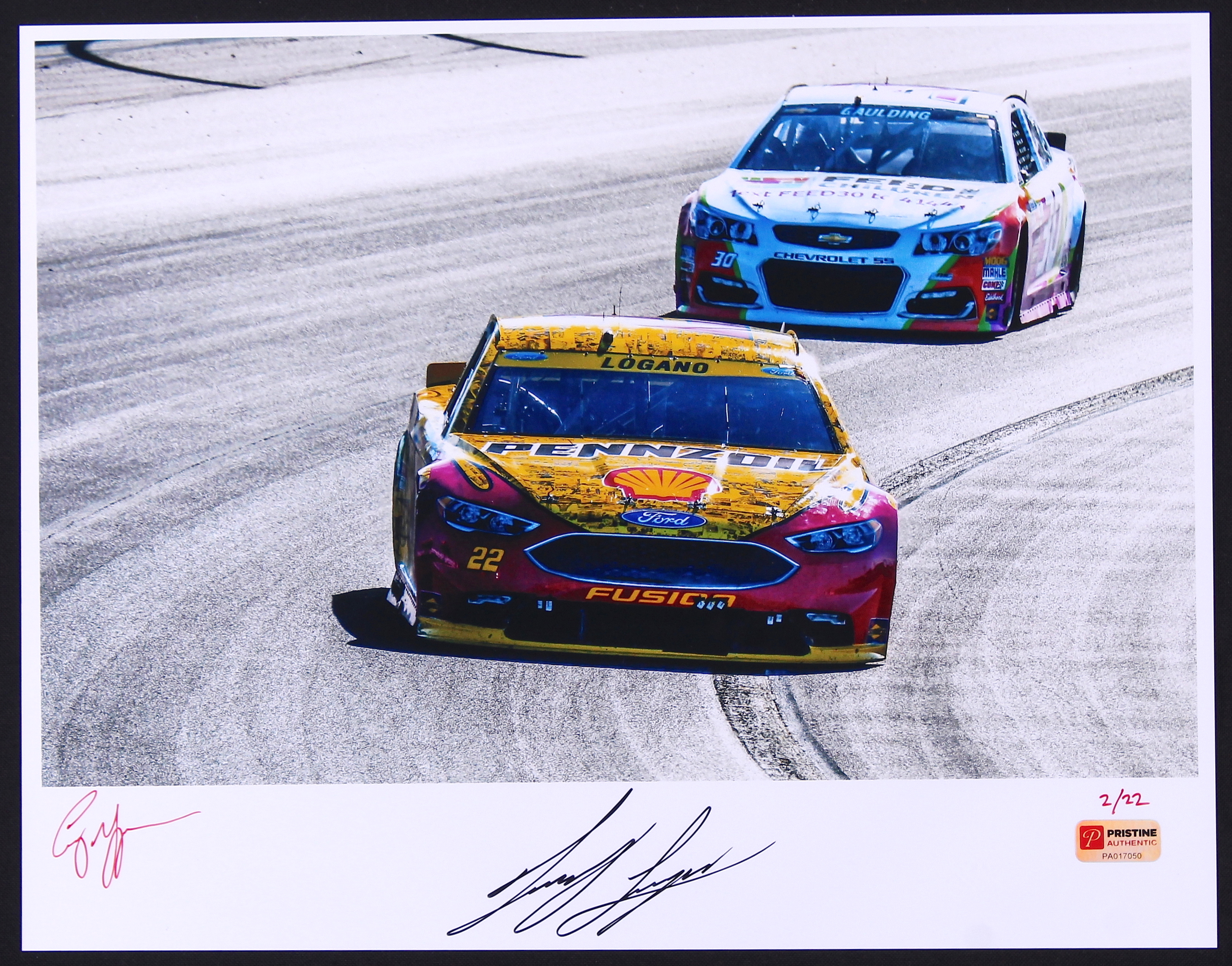 Photo measures 11" x 14" in size and is hand-signed in black felt tip pen by NASCAR superstar Joey Logano. The photo is also hand-signed by talented photographer Corey Grapevine and is limited edition and hand-numbered #/22.