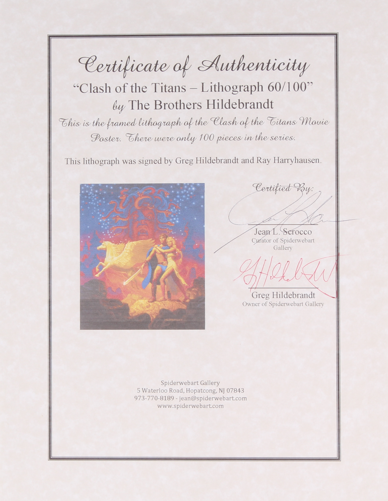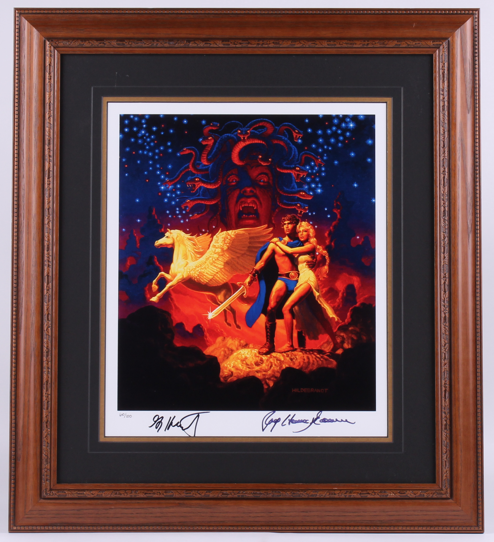 Custom framed lithograph measures 22" x 24" in size. Hand-signed in black felt-tip by original artist Greg Hildebrandt and creator of special visual effects Ray Harryhausen (D. 2013). the lithograph is a limited edition and has been hand-numbered #60/100.