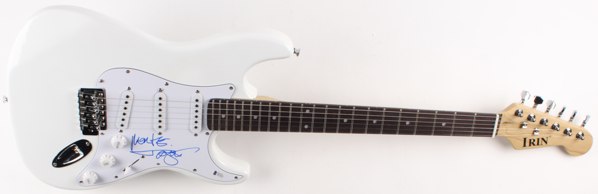 Full-size IRIN electric guitar has been hand-signed in blue felt-tip pen by Tommy Lee.