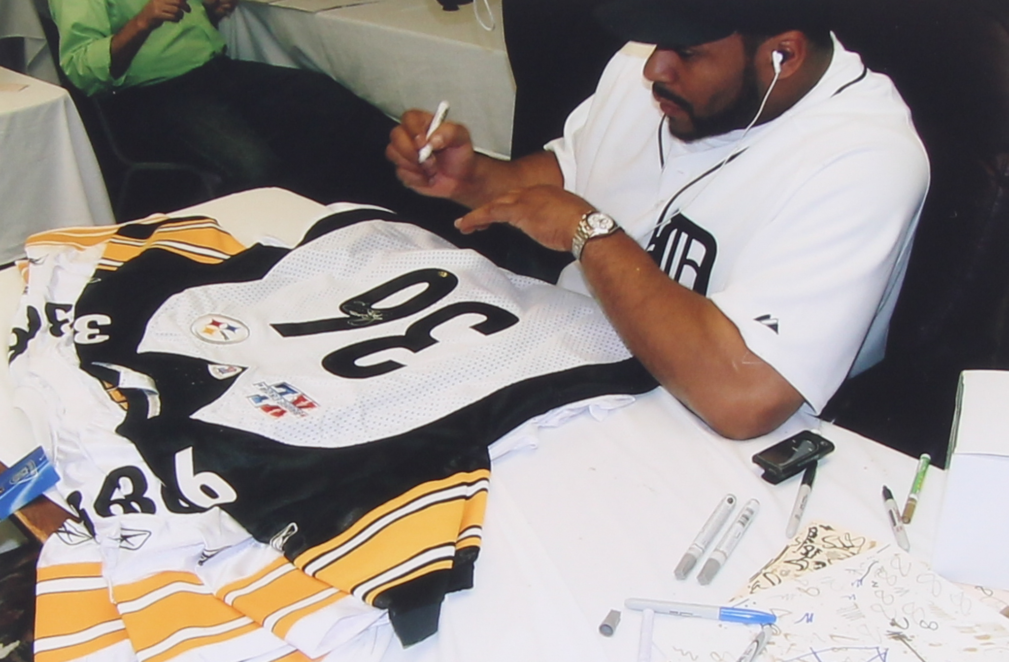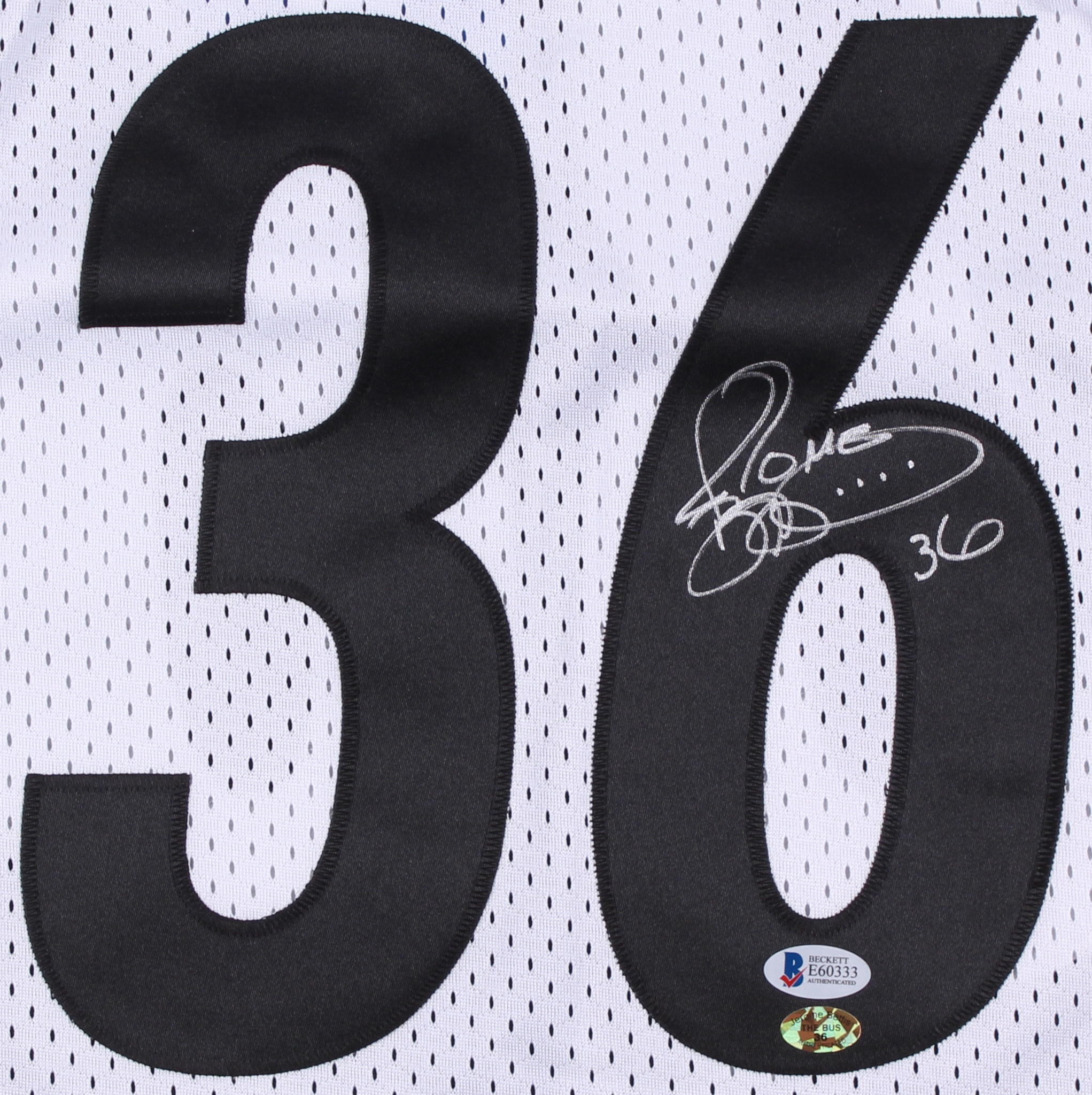 Custom on-field jersey. Everything sewn on, size 52. Hand-signed in silver paint pen by Jerome Bettis (HOF).
