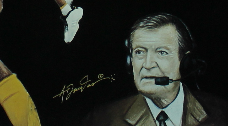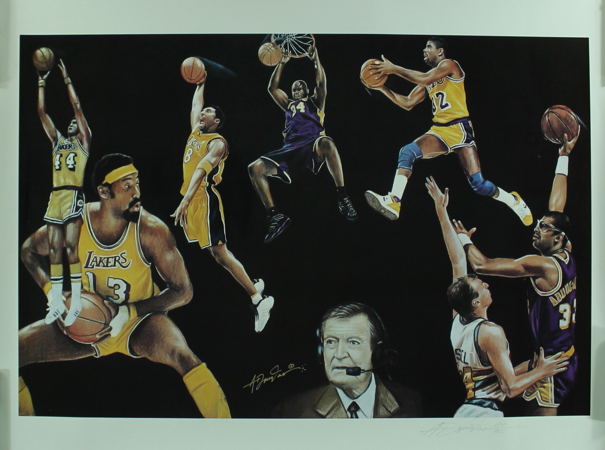 This Limited edition lithograph measures 24" x 18" in size and hand been hand-numbered 26/900. The lithograph has also been hand-signed by artist. The lithograph features legends Kareem Abdul-Jabbar, Magic Johnson, Jerry West, Wilt Chamberlain, Kobe Bryant and Shaquille O'Neal around Lakers long-time play by play announcer Chick Hearn.