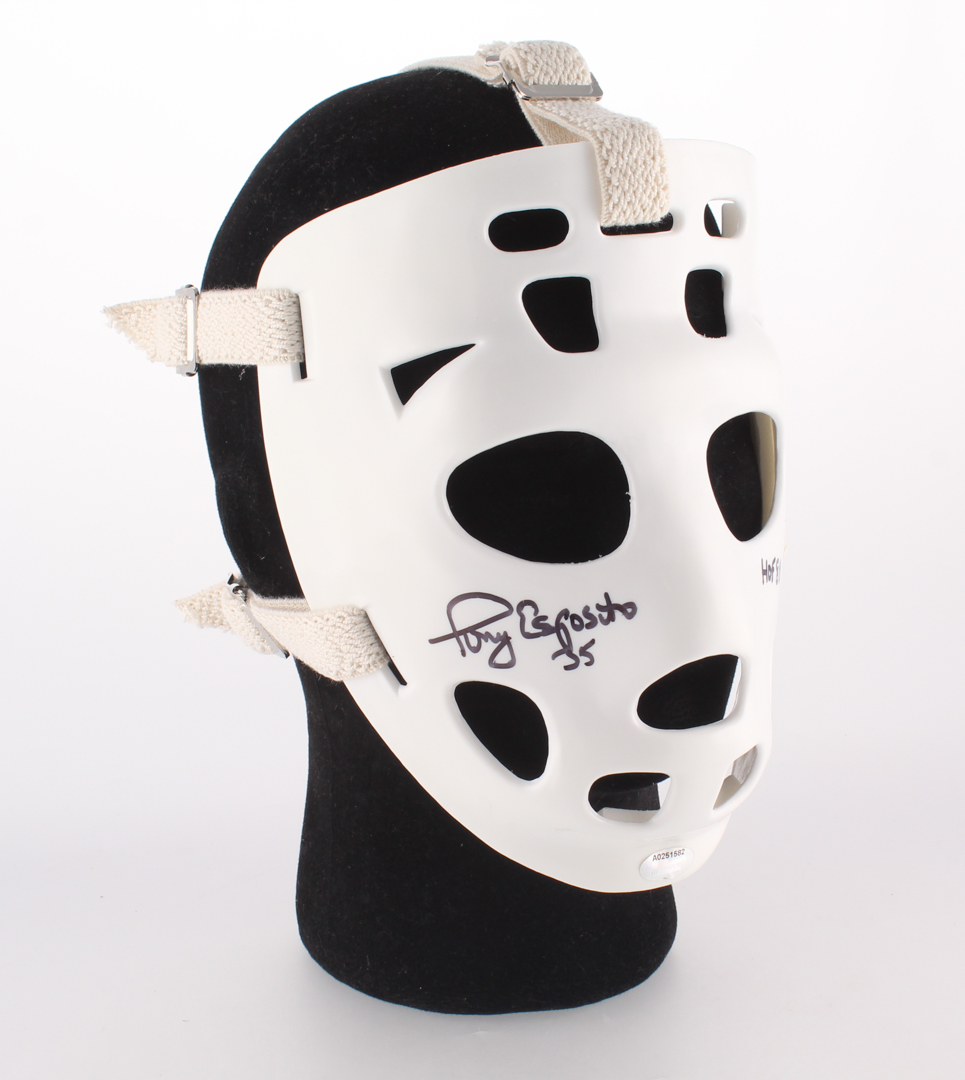 Full-size throwback replica goalie mask has been hand-signed and inscribed in black felt-tip pen by Tony Esposito (HOF, Blackhawks). Please note the mask does not come with the featured stand.