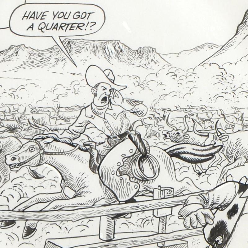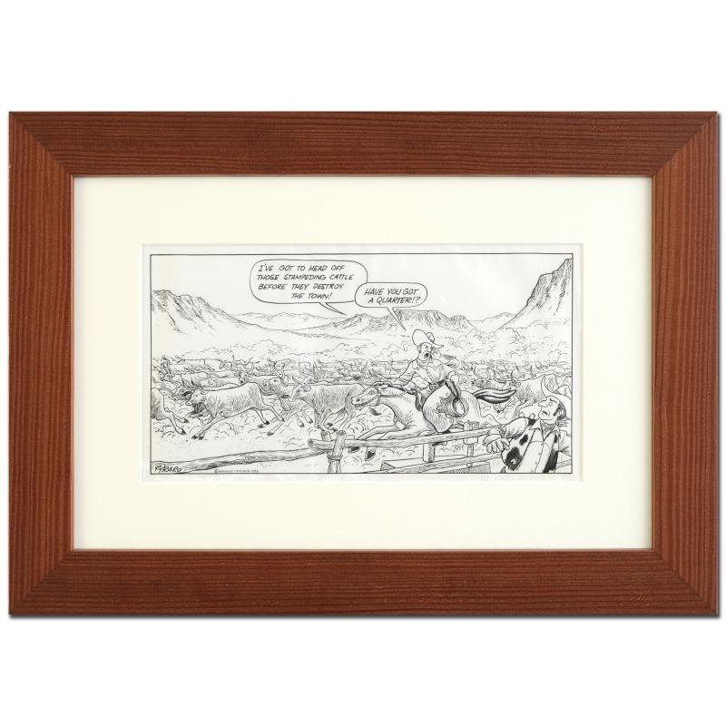Enter a surreal and satirical world of twisted imagination and award winning creativity. "Old West Stampede" is an original pen & ink drawing on paper by Dan Piraro, creator of the critically acclaimed and award winning comic strip, Bizarro! This piece is hand signed and comes framed. Includes Certificate of Authenticity! Measures approx. 21.5" x 15" (with frame), 13" x 7" (image).