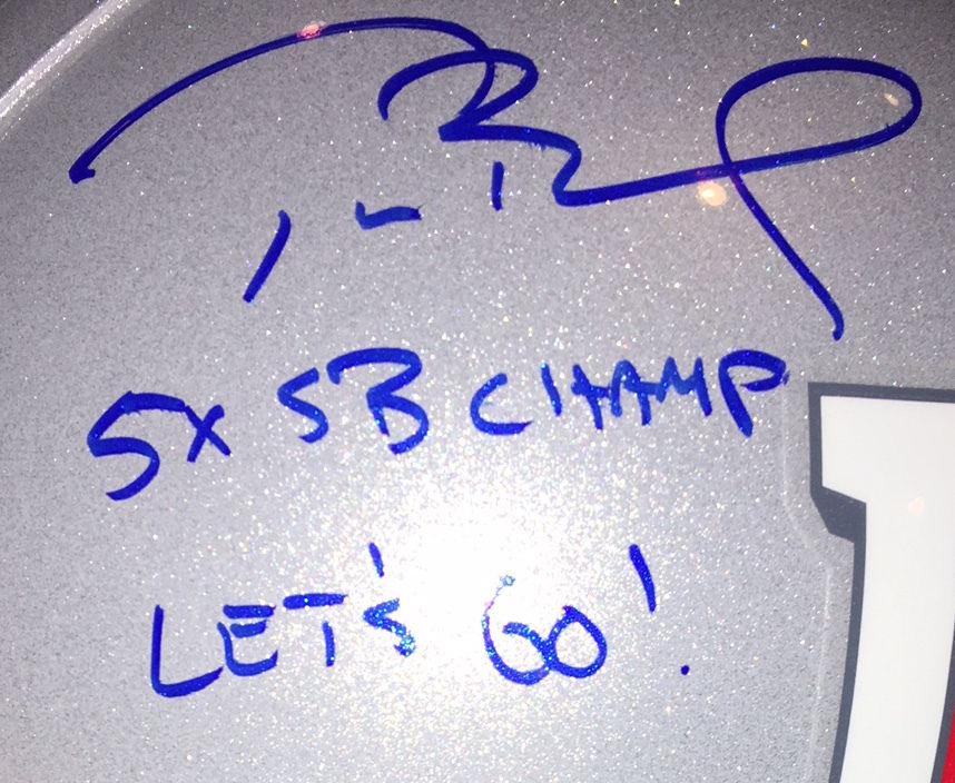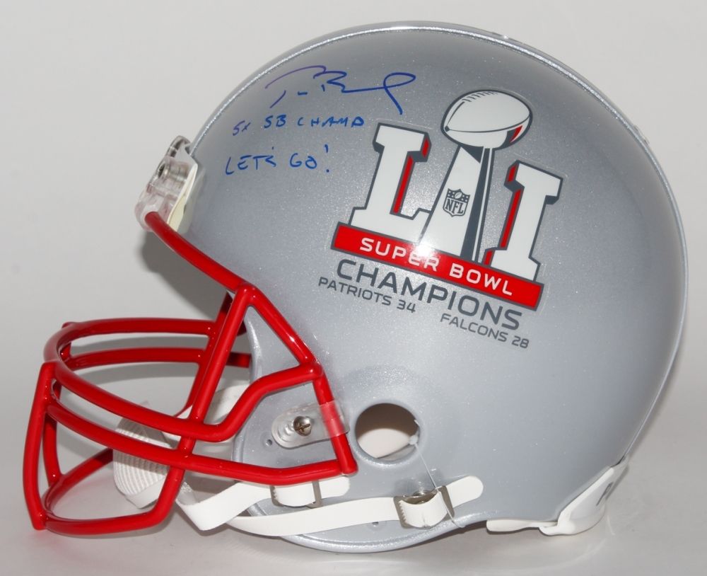 TOM BRADY Signed / Inscribed "5x SB Champ" & "Let's Go!" Authentic Super Bowl 51 Logo on-field Authentic Patriots Helmet! The Patriots are back on top as Super Bowl champions! Now you can celebrate the win with this signed and inscribed Super Bowl LI Logo proline helmet; from the 5x Super Bowl winner, Tom Brady and show it off to all your friends and family! This commemorative helmet features the patented Super Bowl LI logo on one side and the New England Patriots logo on the other. To add to this helmets value, Tom Brady added the rare inscriptions "5x SB Champ" and "Let's Go!" This helmet is limited to only 12 and the winning bidder will receive number "1" from the edition. This piece comes complete with the serial numbered hologram from TriStar Productions. Includes certificate of authenticity and hologram! Brady's signature is guaranteed authentic through the TriStar Productions serial numbered hologram system.