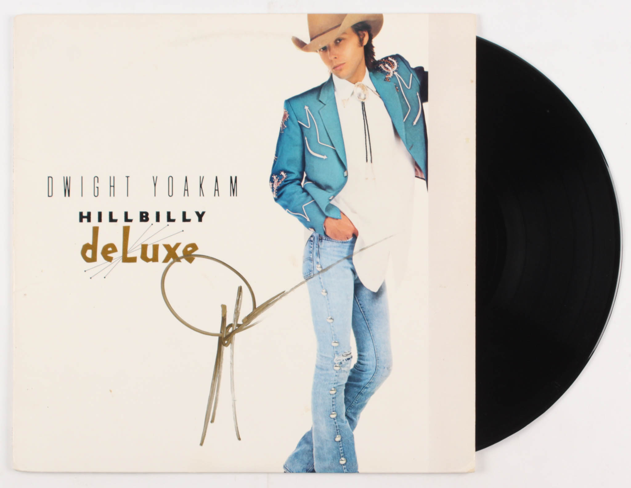 Dwight Yoakam "Hillbilly Deluxe" Vinyl Record Album Cover. Cover has been hand-signed in gold paint pen by Dwight Yoakam. Please note that the record is included in the auction.
