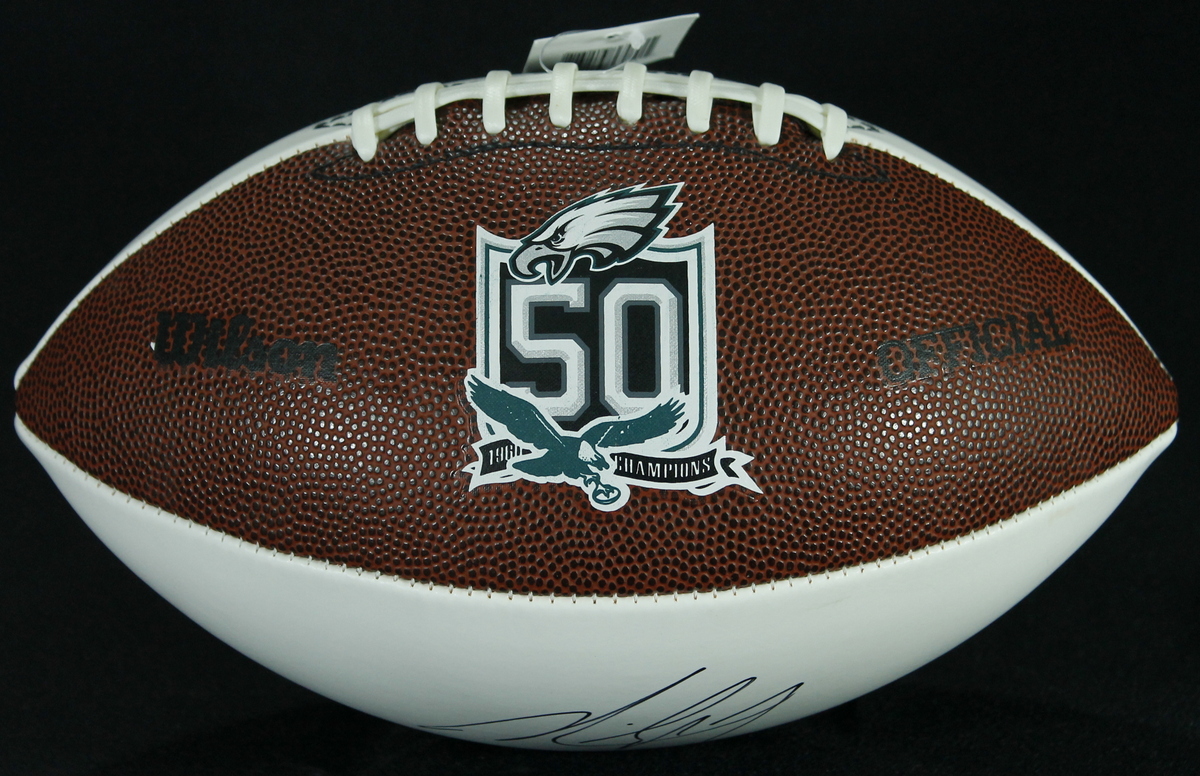 Eagles Logo full-size Football. Hand-signed in black felt-tip pen by Michael Vick (Eagles). Autograph includes an official Michael Vick Hologram and COA for authenticity purposes.