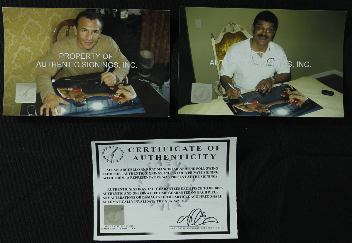 Photo measures 16" x 20" and has been hand-signed in silver paint pen by Ray Mancini & Alexis Arguello. The autograph includes an official Authentic Signings hologram and matching COA for authenticity purposes.