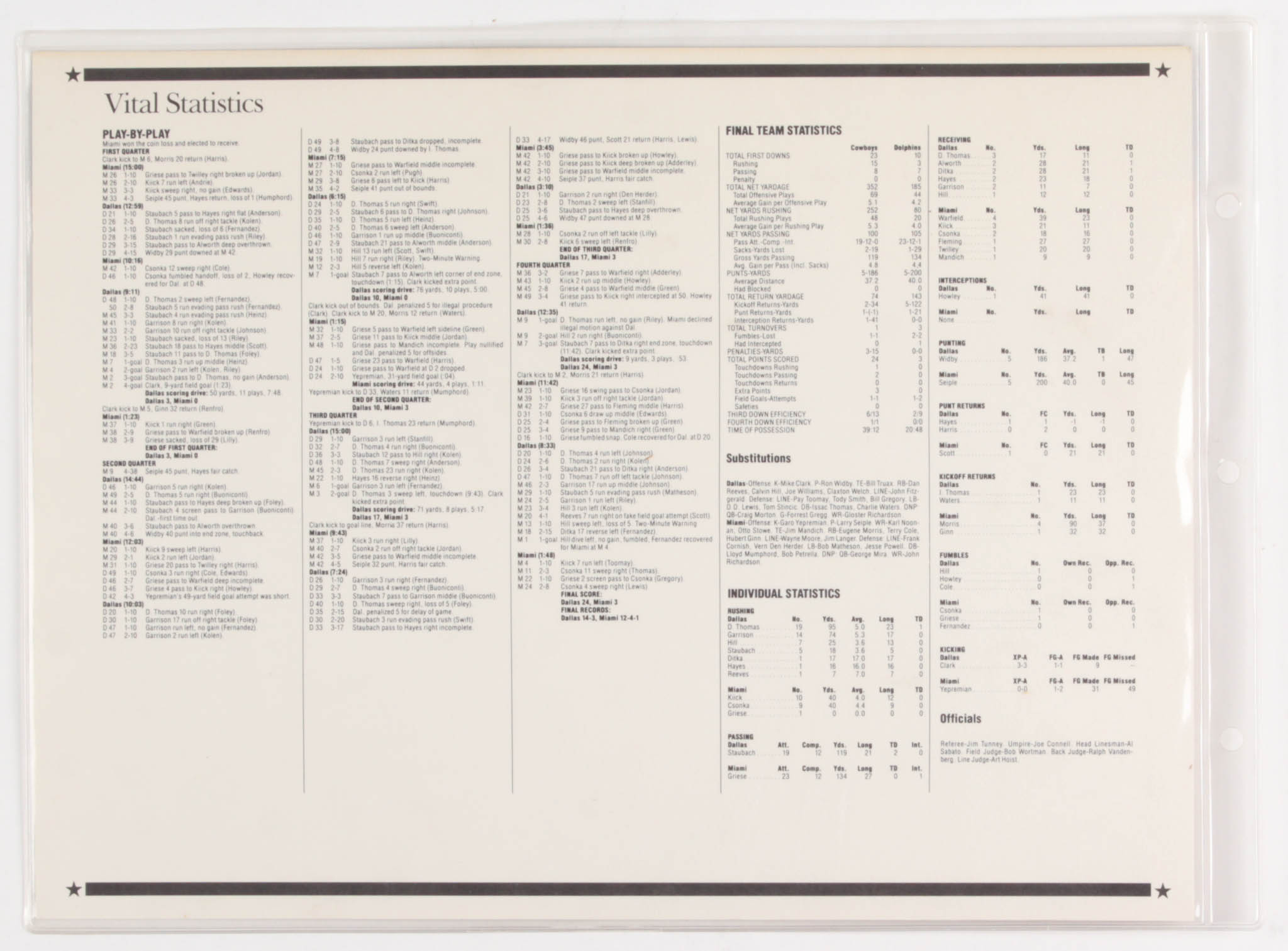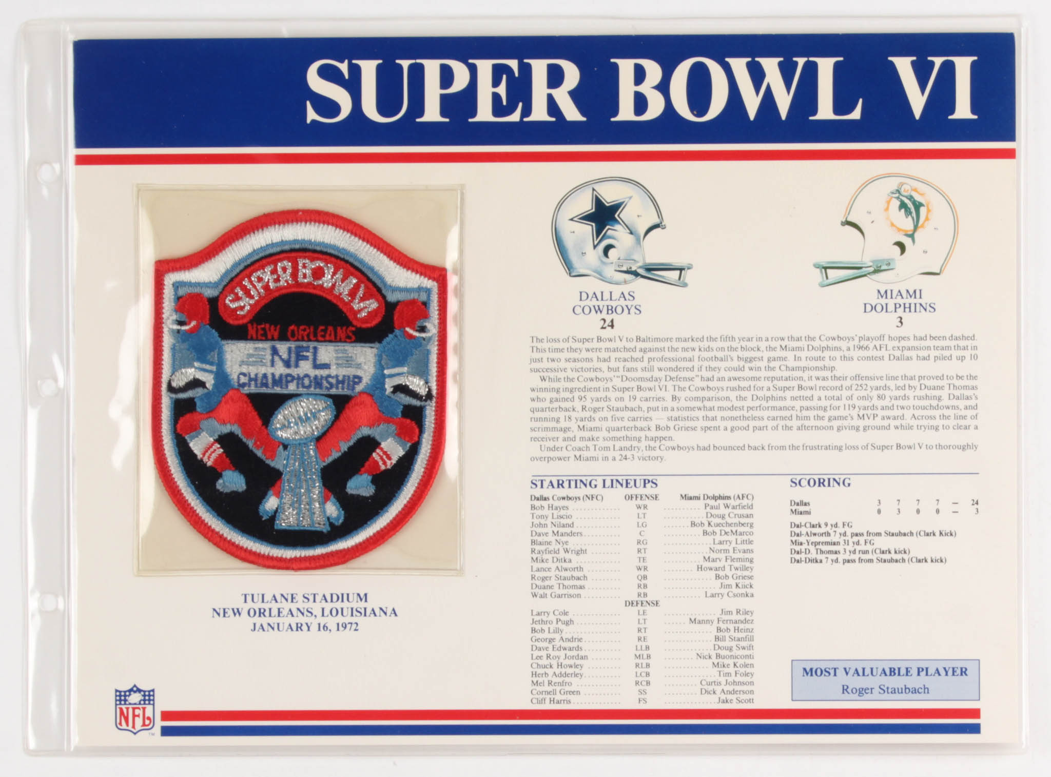 Cowboys vs. Dolphins Super Bowl VI Patch with 12" x 9" Statistic Card.