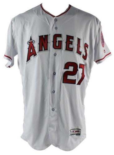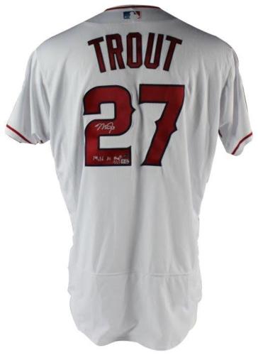 Majestic on-field style jersey. Everything is sewn on. Hand-signed and inscribed in silver paint pen by Mike Trout. The jersey is a limited edition and has been hand-numbered #1/27.