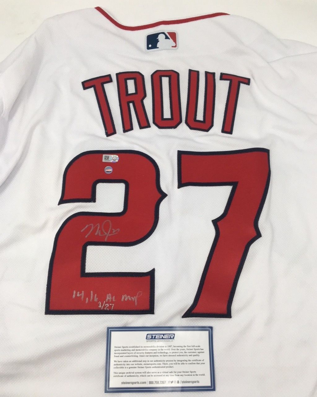 This authentic jersey has been hand signed and inscribed by Mike Trout. Trout added the rare inscription "14, 16 AL MVP" to this limited edition jersey making it a true collectible. The signature on this item has been authenticated by Major League Baseball and features a uniquely numbered tamper-proof hologram which can be verified in the Major League Baseball online database. This process ensures your item is authentic and prevents duplication and fraud. In addition, a Steiner Sports hologram and a certificate is included. This jersey is limited to only 27 and you are bidding on number "1" from the edition. 100% Guaranteed Authentic Features Tamper-Evident Steiner Hologram Perfect Collector's Item Includes certificate of authenticity and hologram! Trout's signature is guaranteed authentic through the Steiner Sports Authenticated serial numbered hologram system.
