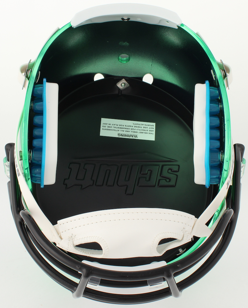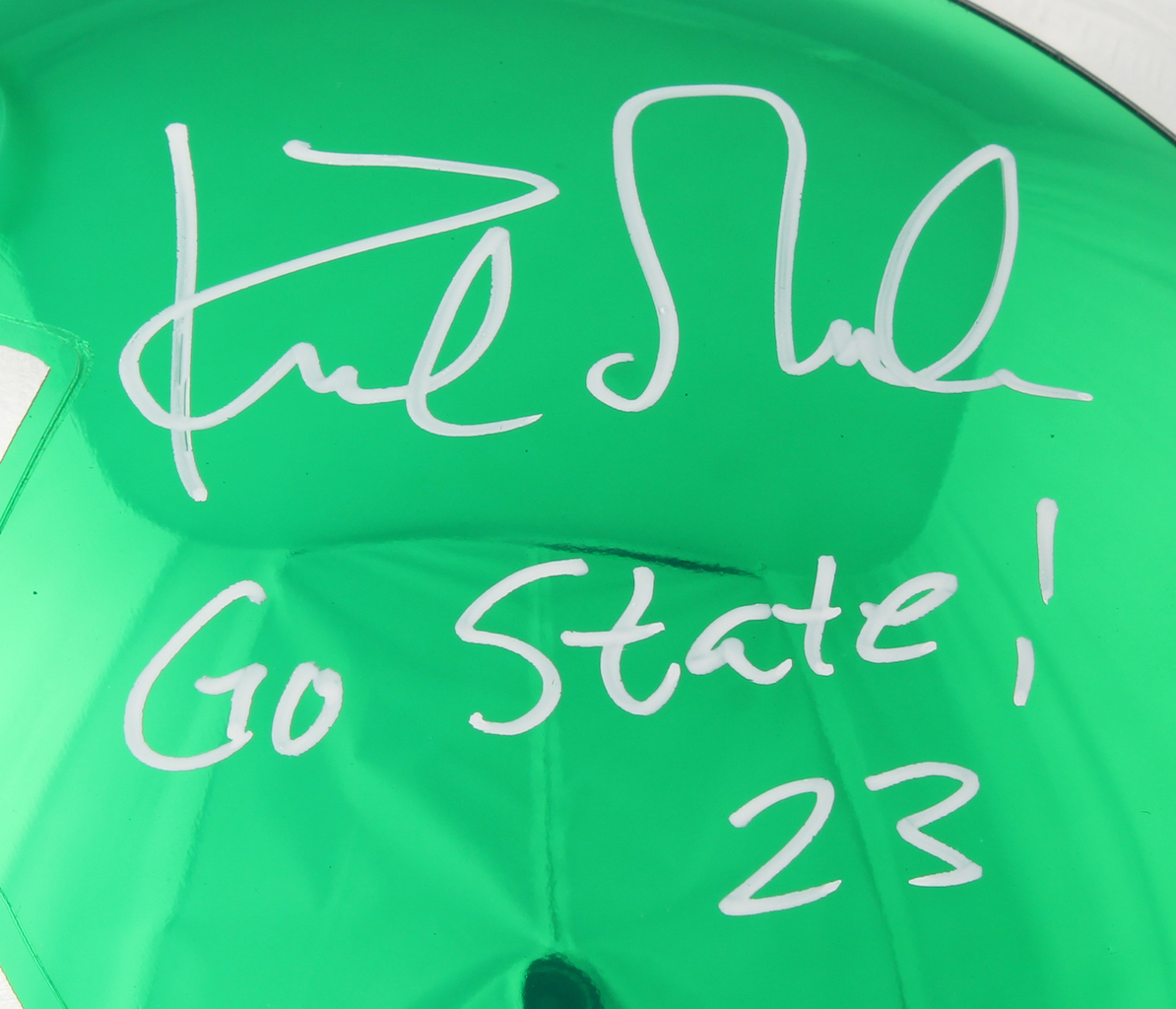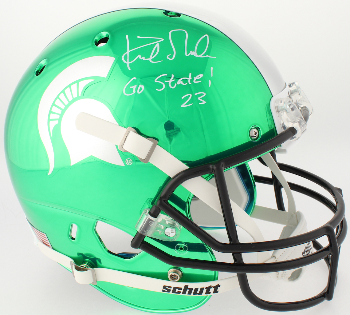 Schutt Michigan State Spartans full-size replica chrome helmet. Hand-signed and inscribed in white paint pen by Kirk Gibson.