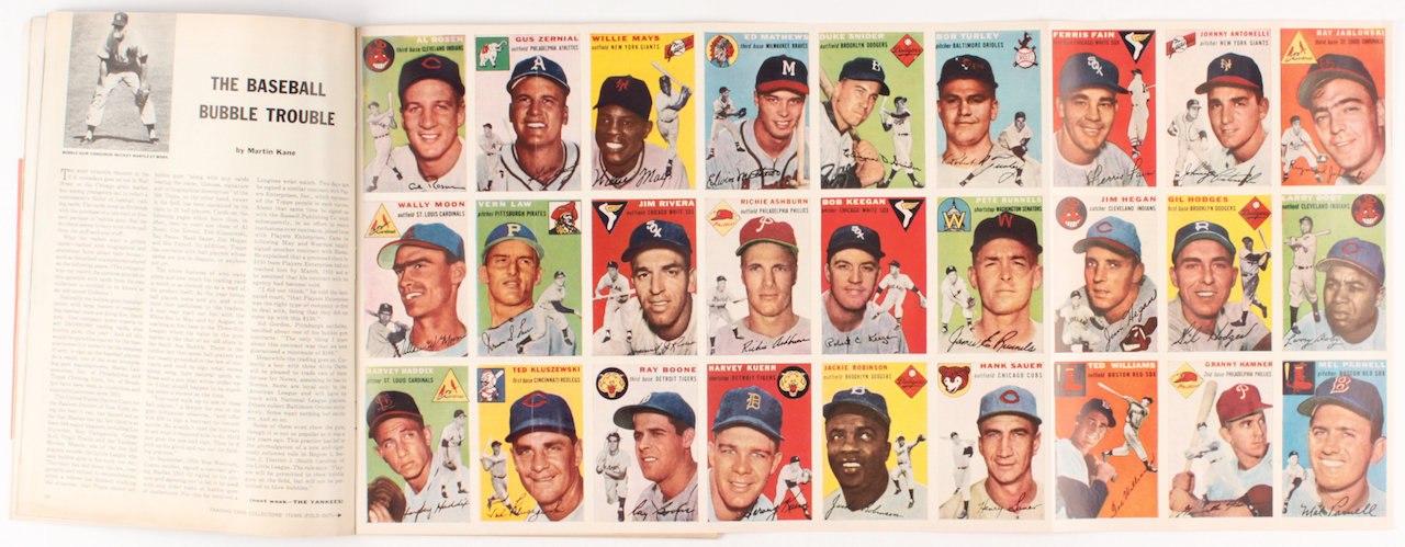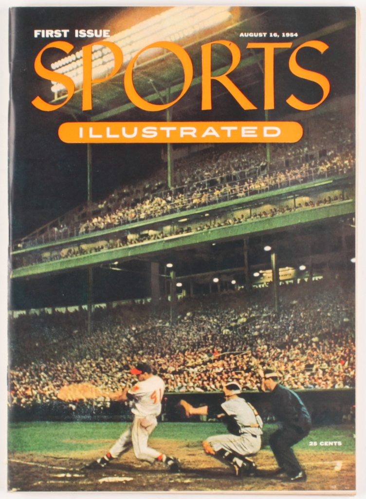 First Issue Sports Illustrated magazine is dated August 16, 1954. 1954 Topps cards of Ted Williams, Jackie Robinson, and Willie Mays! Also comes with a folder display and a certificate of authenticity from Sports Illustrated.