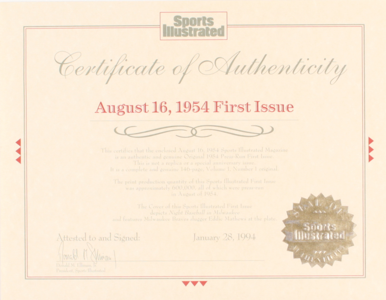 Original High Grade First Issue Sports Illustrated Magazine from August 16, 1954 with Leather Portfolio (Sports Illustrated COA)