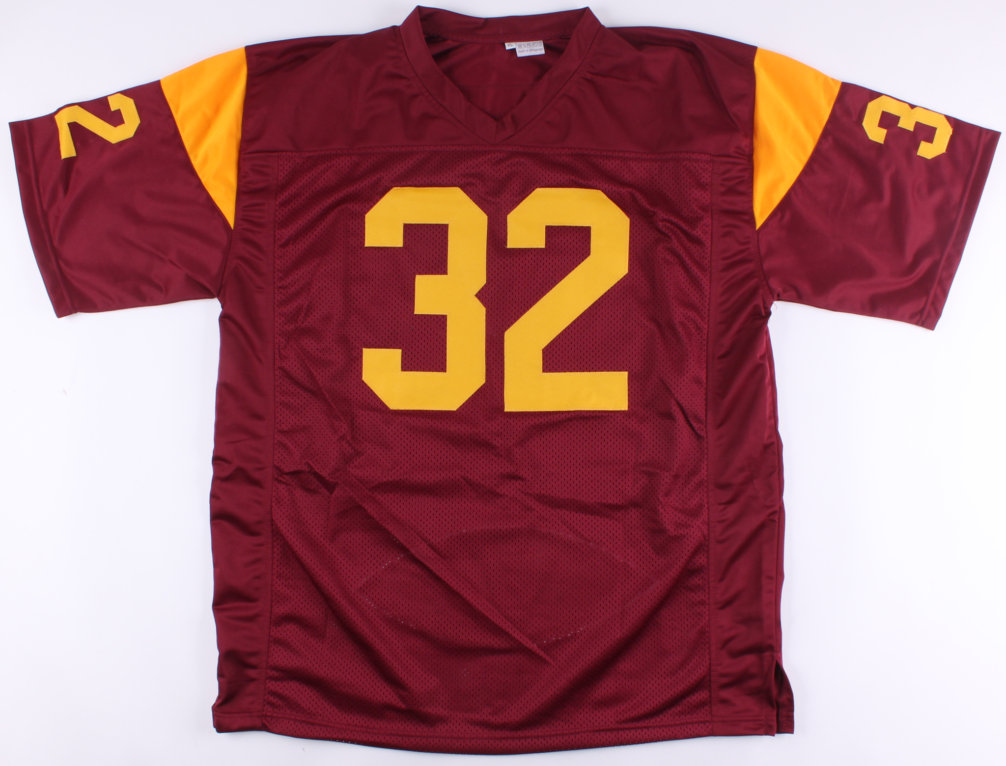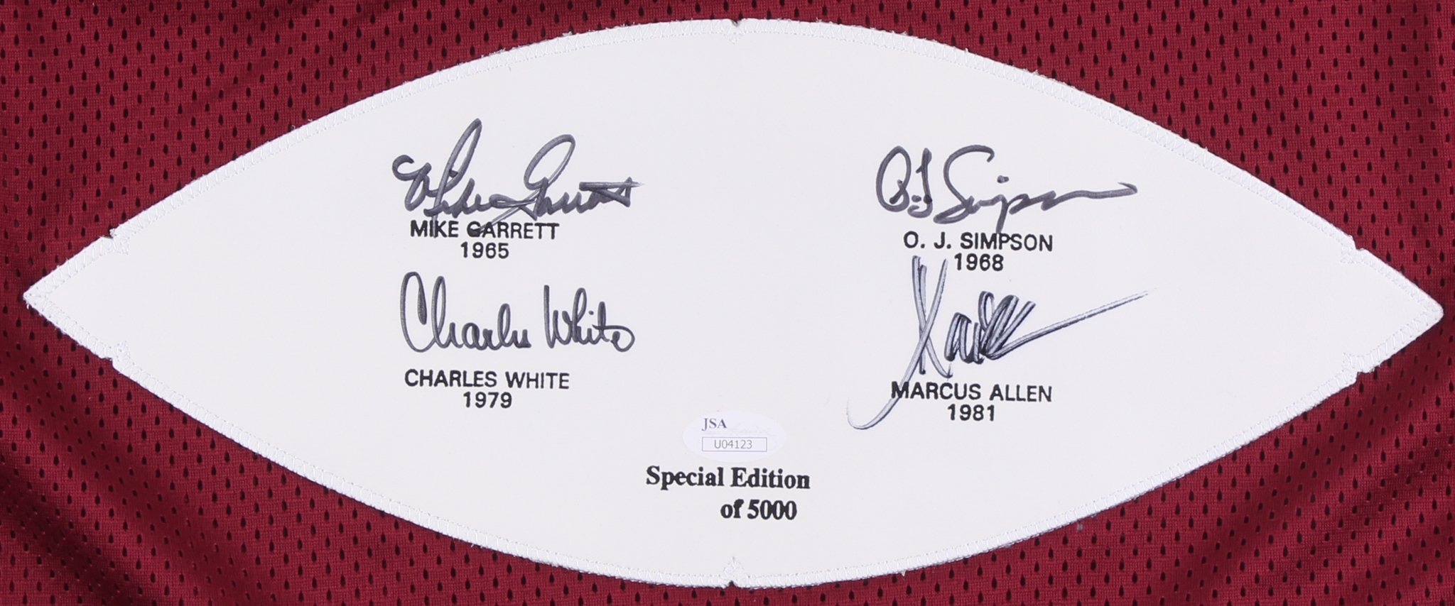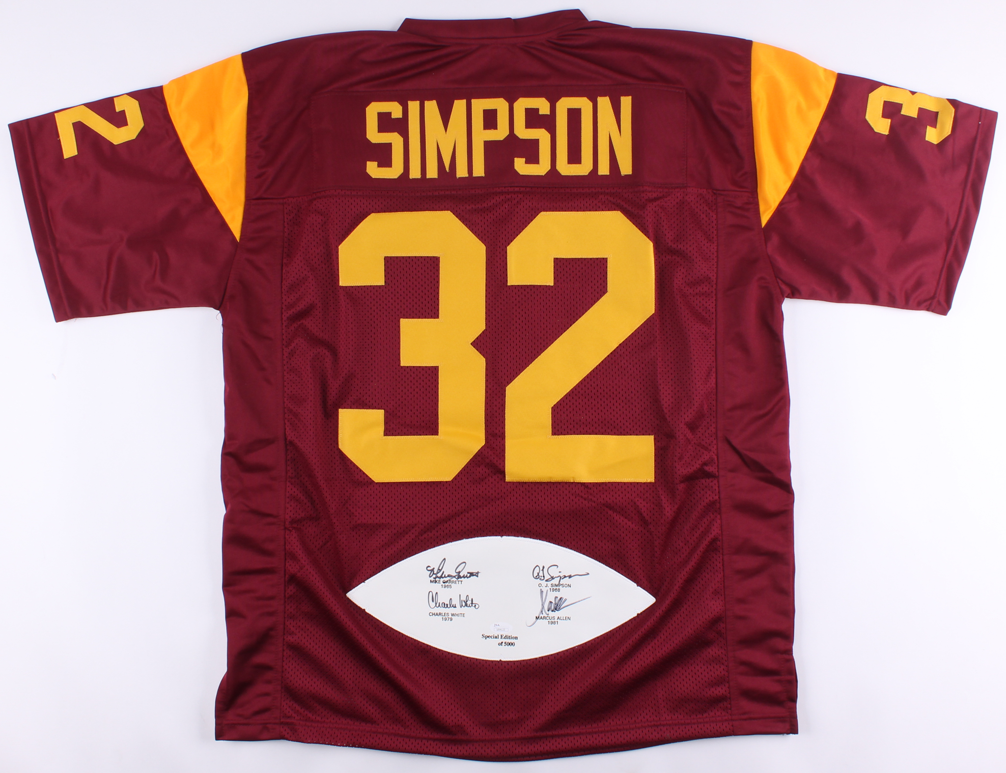 Custom on-field style jersey. Everything sewn on, size XL. Hand-signed in black felt-tip pen by (4) USC Heisman Trophy winners including Marcus Allen (HOF), Charles White, Mike Garrett, and O. J. Simpson (HOF). Please note, the item is limited edition and has been numbered #/5000.