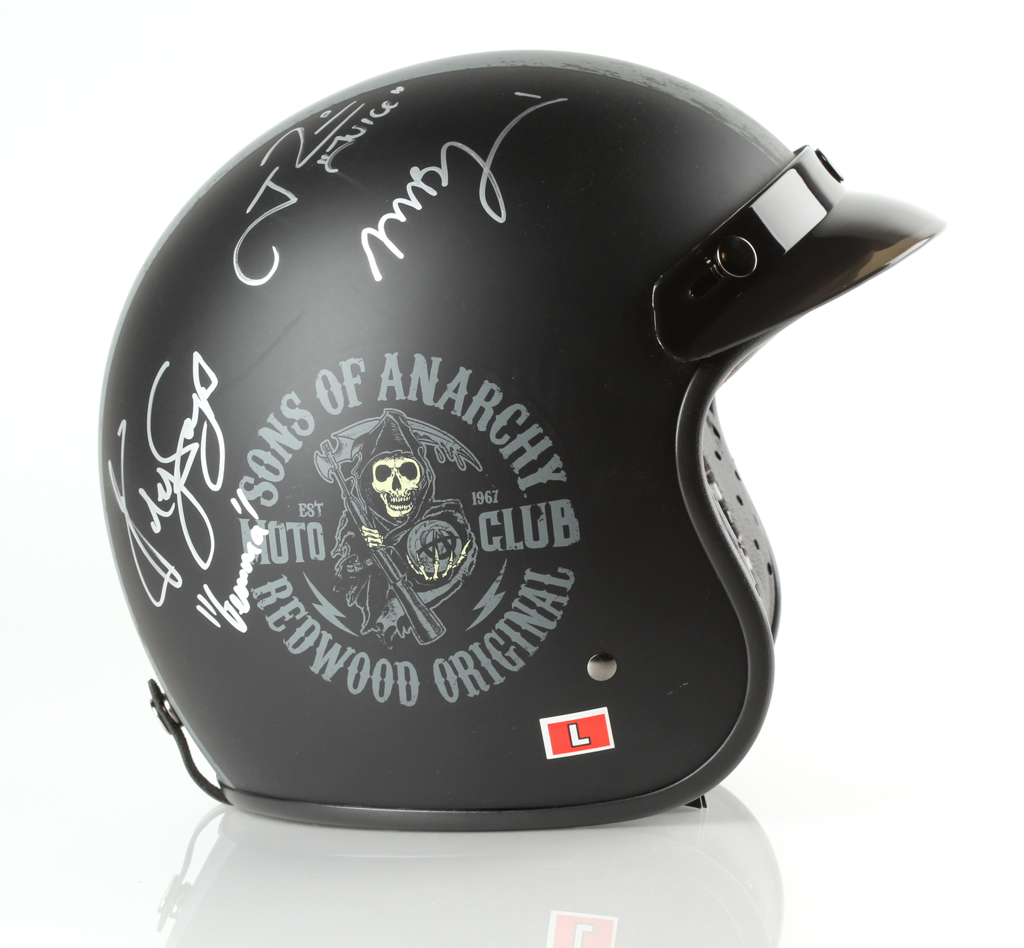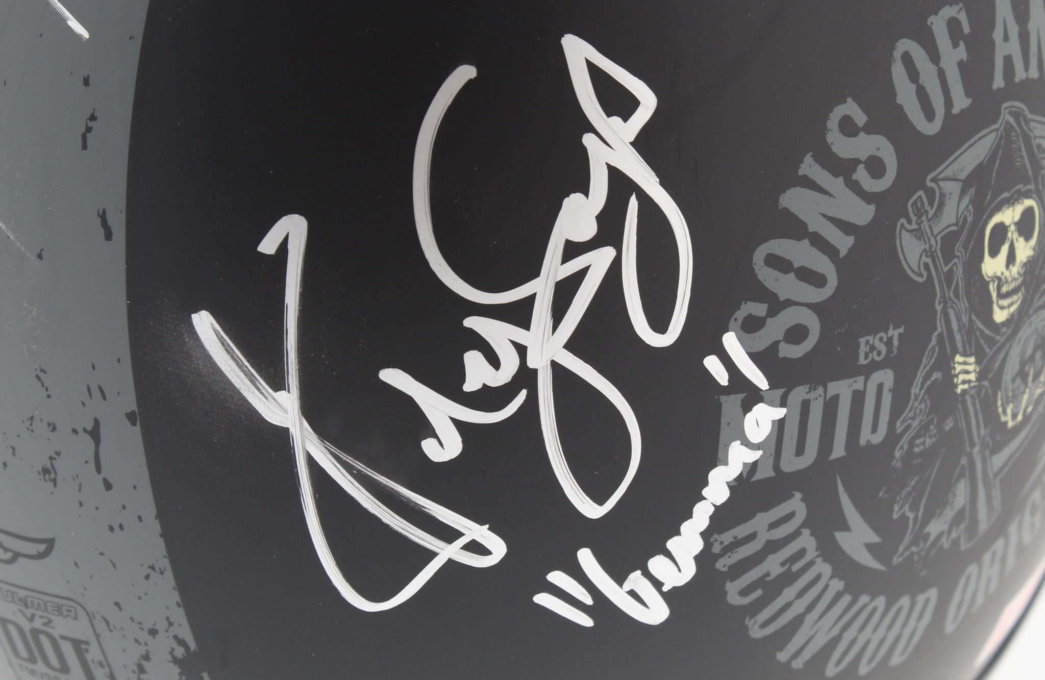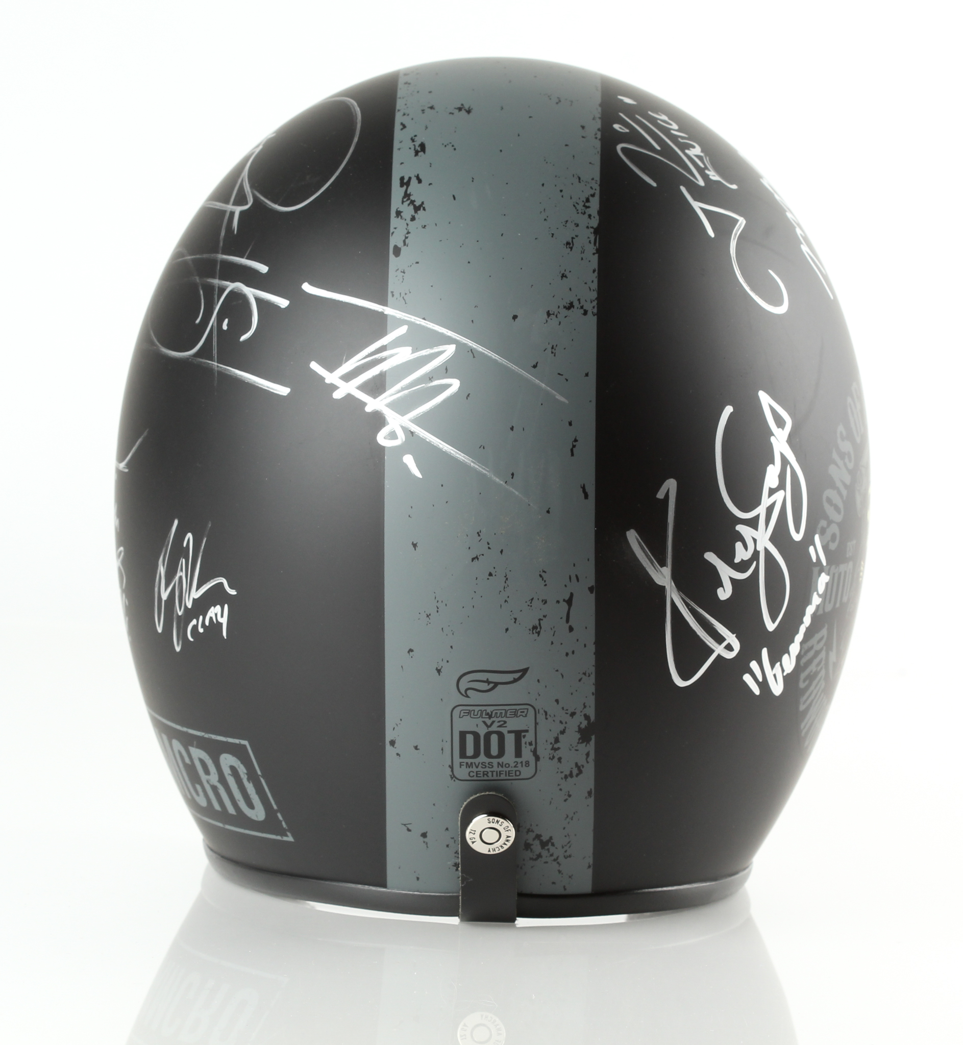 Fulmer Helmets "Sons of Anarchy" full-size biker helmet. Hand-signed in silver paint pen by (7) cast members including Kim Coates, Ryan Hurst, Theo Rossi, Katey Sagal, Ron Perlman, Tommy Flanagan, and Mark Boone Junior