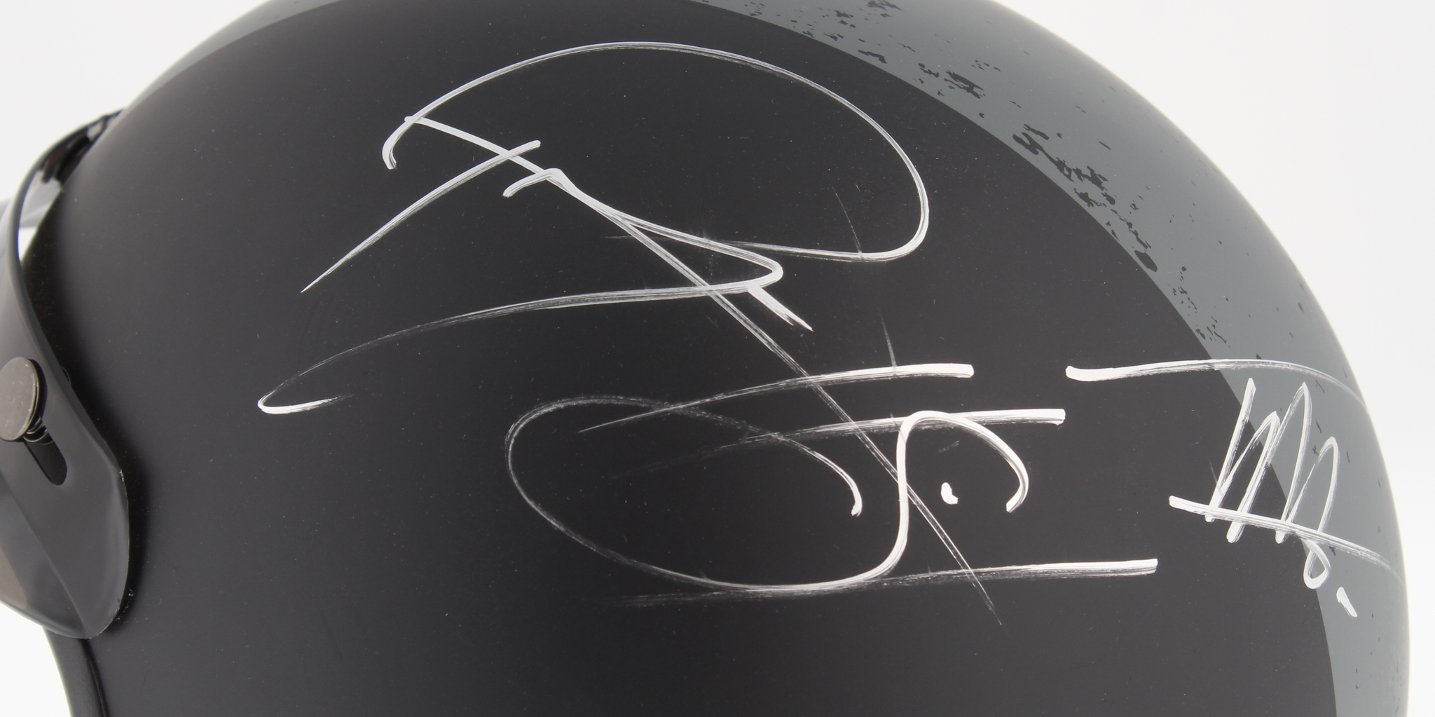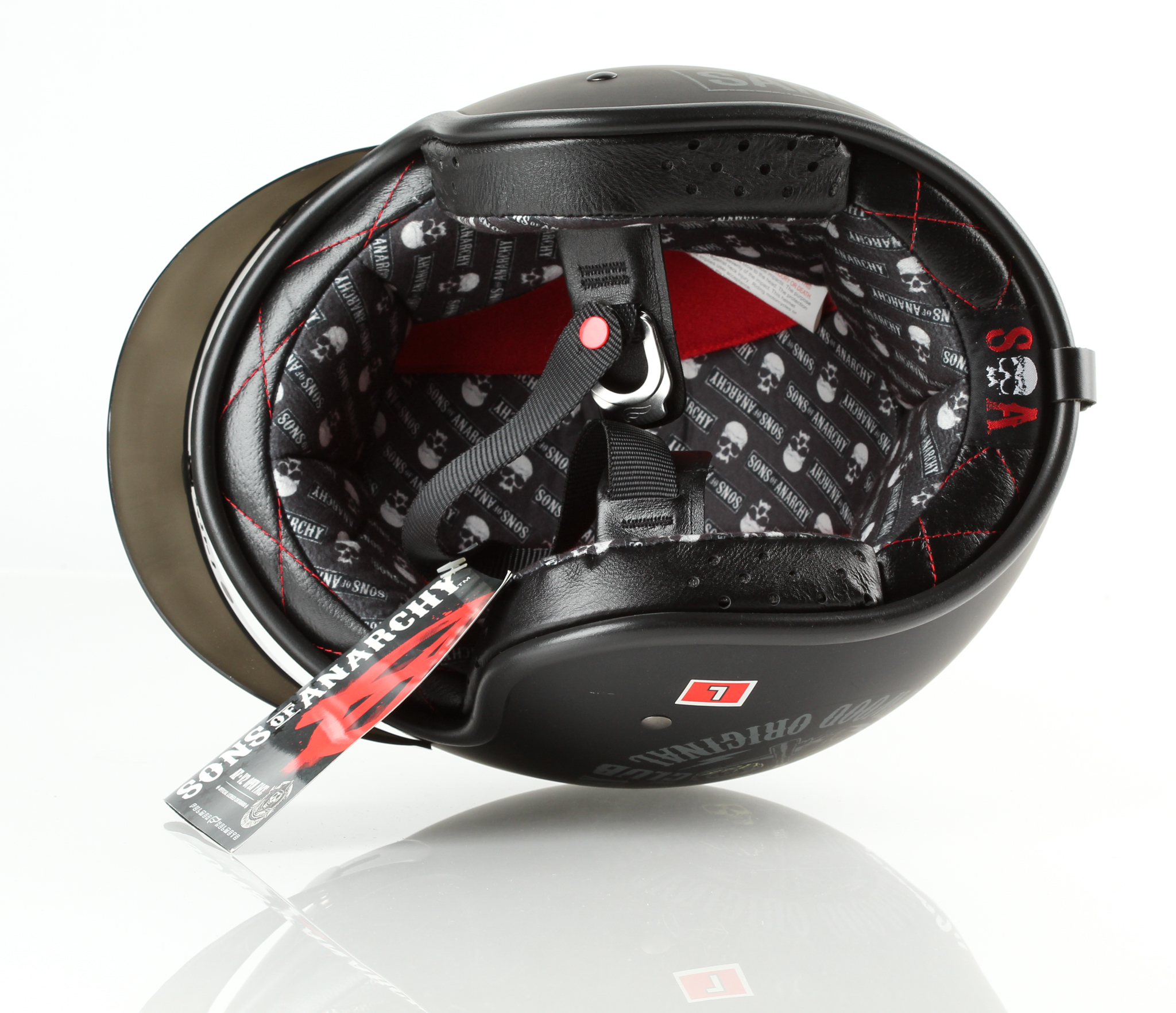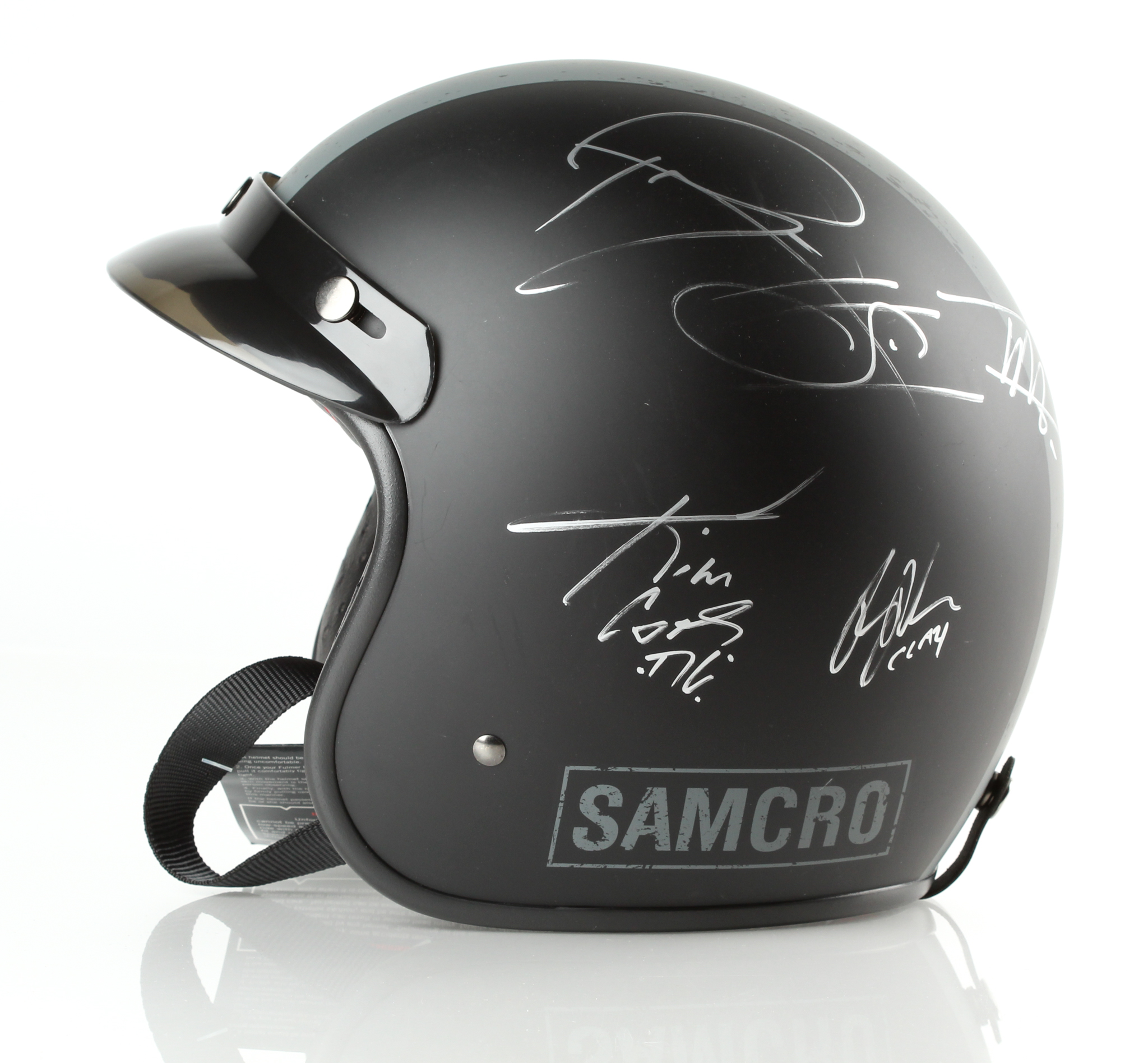 Fulmer Helmets "Sons of Anarchy" full-size biker helmet. Hand-signed in silver paint pen by (7) cast members including Kim Coates, Ryan Hurst, Theo Rossi, Katey Sagal, Ron Perlman, Tommy Flanagan, and Mark Boone Junior