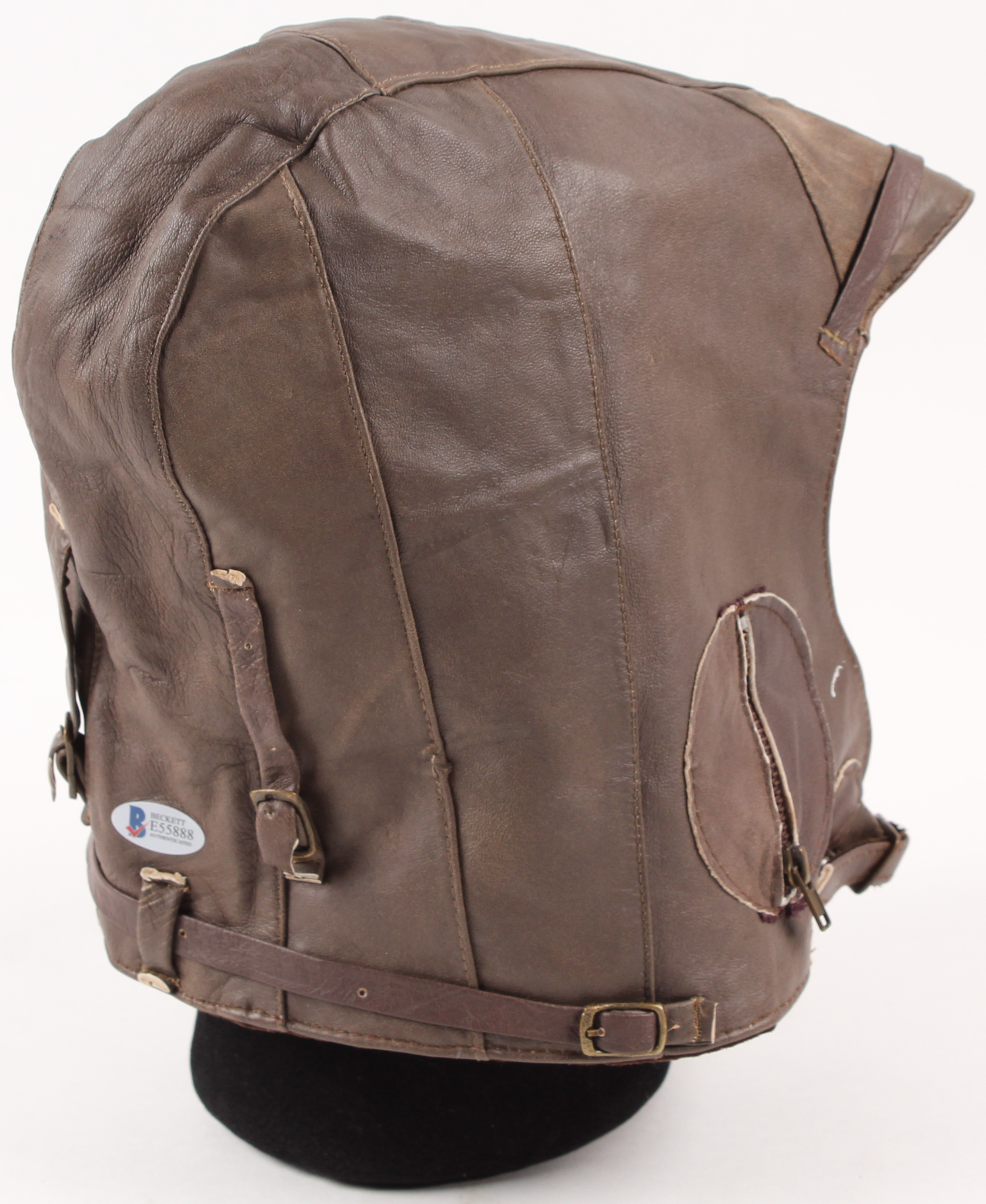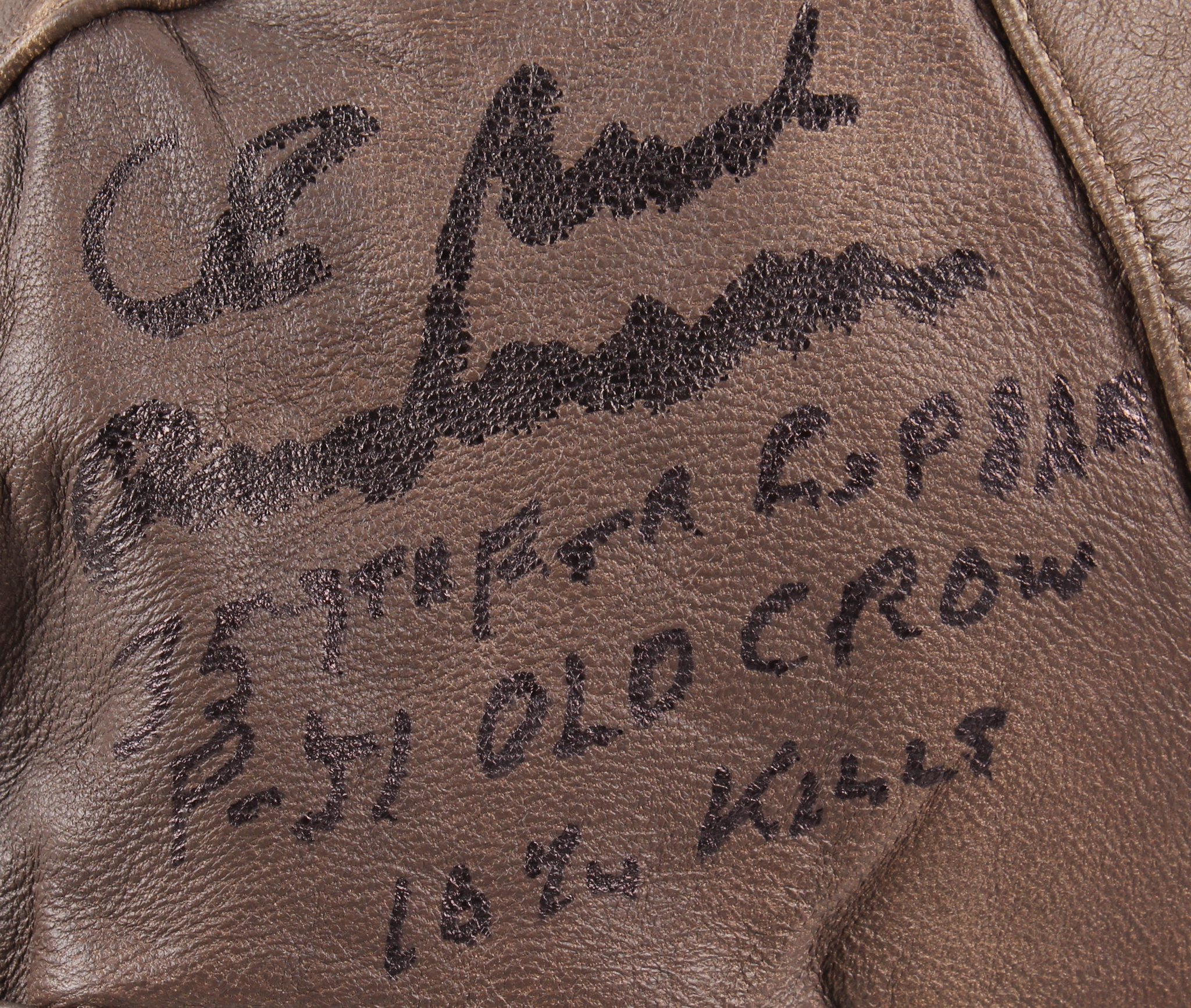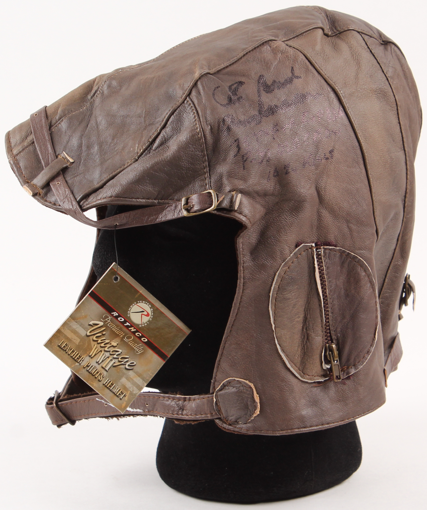Rothco leather replica pilot's helmet has been hand-signed in black felt-tip pen by Bud Anderson.