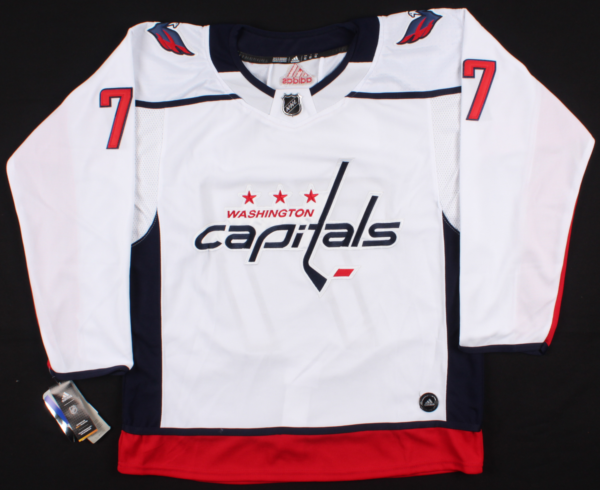 Adidas authentic on-ice style jersey. Everything is sewn on, size 52. Hand-signed and inscribed in black felt-tip pen by T. J. Oshie.