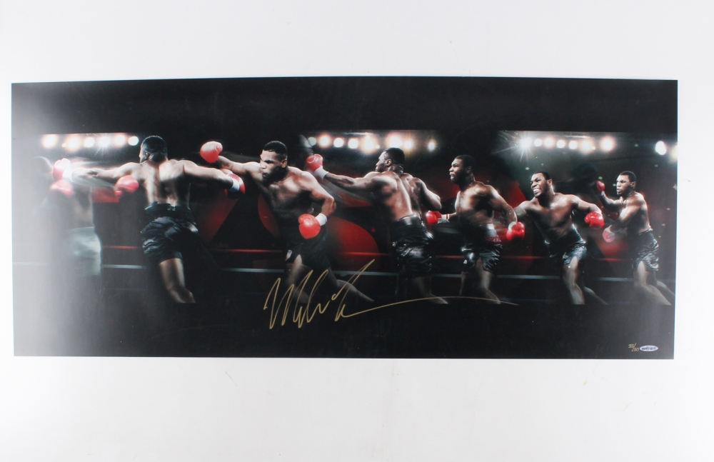 Photo measures 15" x 36" in size and is hand-signed in gold paint pen by Mike Tyson (HOF). Photo is limited edition and has been hand-numbered #/50.
