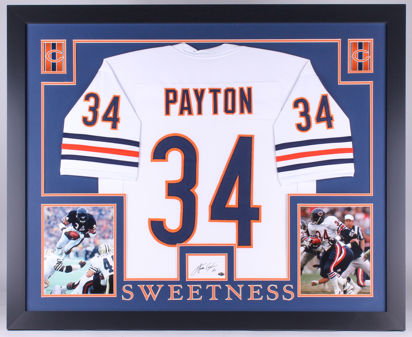 Custom frame measures approximately 35" x 43" in size. The jersey display features a cut which has been hand-signed in black felt-tip pen by Walter Payton (D. 1999, HOF). Also includes an unsigned jersey to complete a beautiful display.