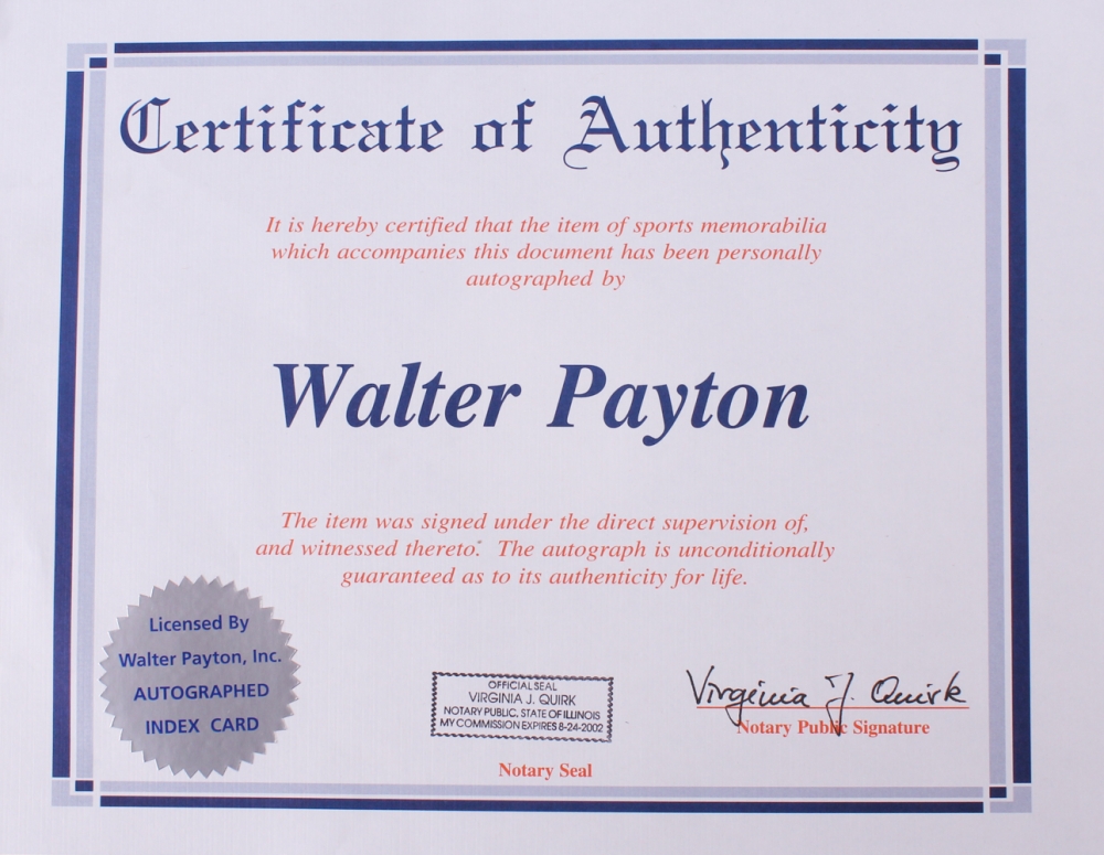 The autograph includes an official Walter Payton hologram and COA for authenticity purposes.