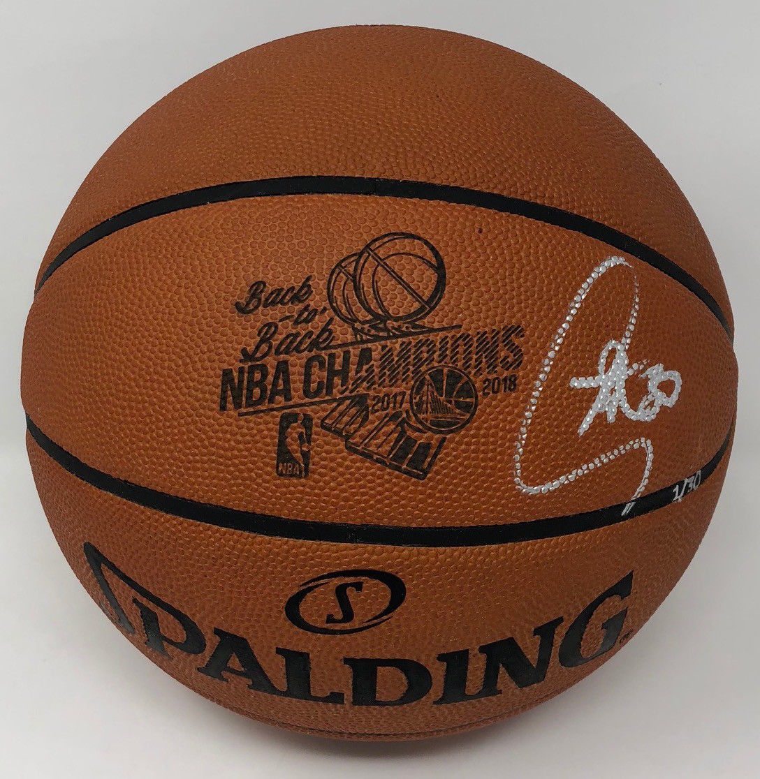 Spalding "Back-to-Back NBA Champions" Official NBA Game Ball basketball has been hand-signed in silver paint pen by Stephen Curry (Golden State Warriors). The basketball is a limited edition and has been hand-numbered #1/30.