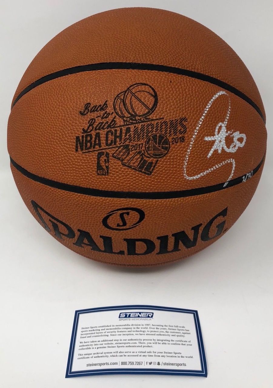 Up for auction is an authentic Spalding basketball hand signed by Stephen Curry. In addition, this ball includes special commemorative laser engraving with the official "B2B Champions" logo. This authentic basketball has been hand signed by Stephen Curry. Pound for pound the greatest pure shooter the game of basketball has ever seen, Curry has captivated basketball fans across the globe with his unique style of play. It's this outstanding play that has earned him two NBA most valuable player awards and helped bring three world championships to the Golden State Warriors. The signature on this item has been authenticated by Steiner Sports and features a uniquely numbered tamper-proof hologram which can be verified in our online database. This process ensures your item is authentic and prevents duplication and fraud This item is limited to 30 and you are bidding on number "1" from the edition. This autographed basketball includes a Steiner Sports certificate of authenticity with a unique hologram number that corresponds to the hologram on the actual collectible. These holograms protect the integrity of the product and serve to guarantee the authenticity of the memorabilia.