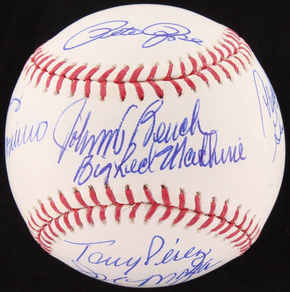 Rawlings Official Major League Baseball. Baseball has been hand-signed in blue ink pen by (8) members of Reds "Big Red Machine" including Pete Rose, Johnny Bench, Joe Morgan, Ken Griffey Sr., Tony Perez, Cesar Geronimo, Dave Conception & George Foster.