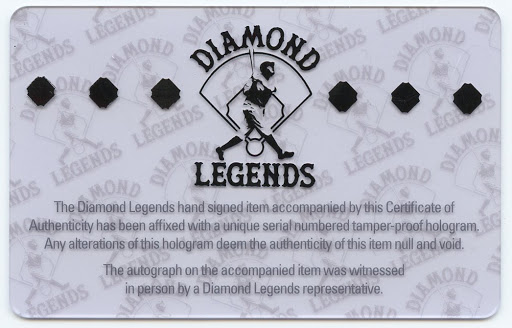 The Diamond Legends hand signed item accompanied by this Certificate of Authenticity has been affixed with a unique serial numbered tamper-proof hologram. Any alterations of this hologram deem the authenticity of this item null and void. The autograph on this item was witnessed in person by a Diamond Legends representative.