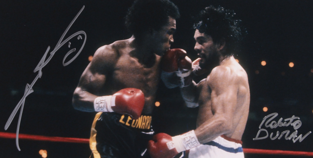 Photo measures 16" x 20" in size and has been hand-signed in silver paint pen by Sugar Ray Leonard and Roberto Duran.
