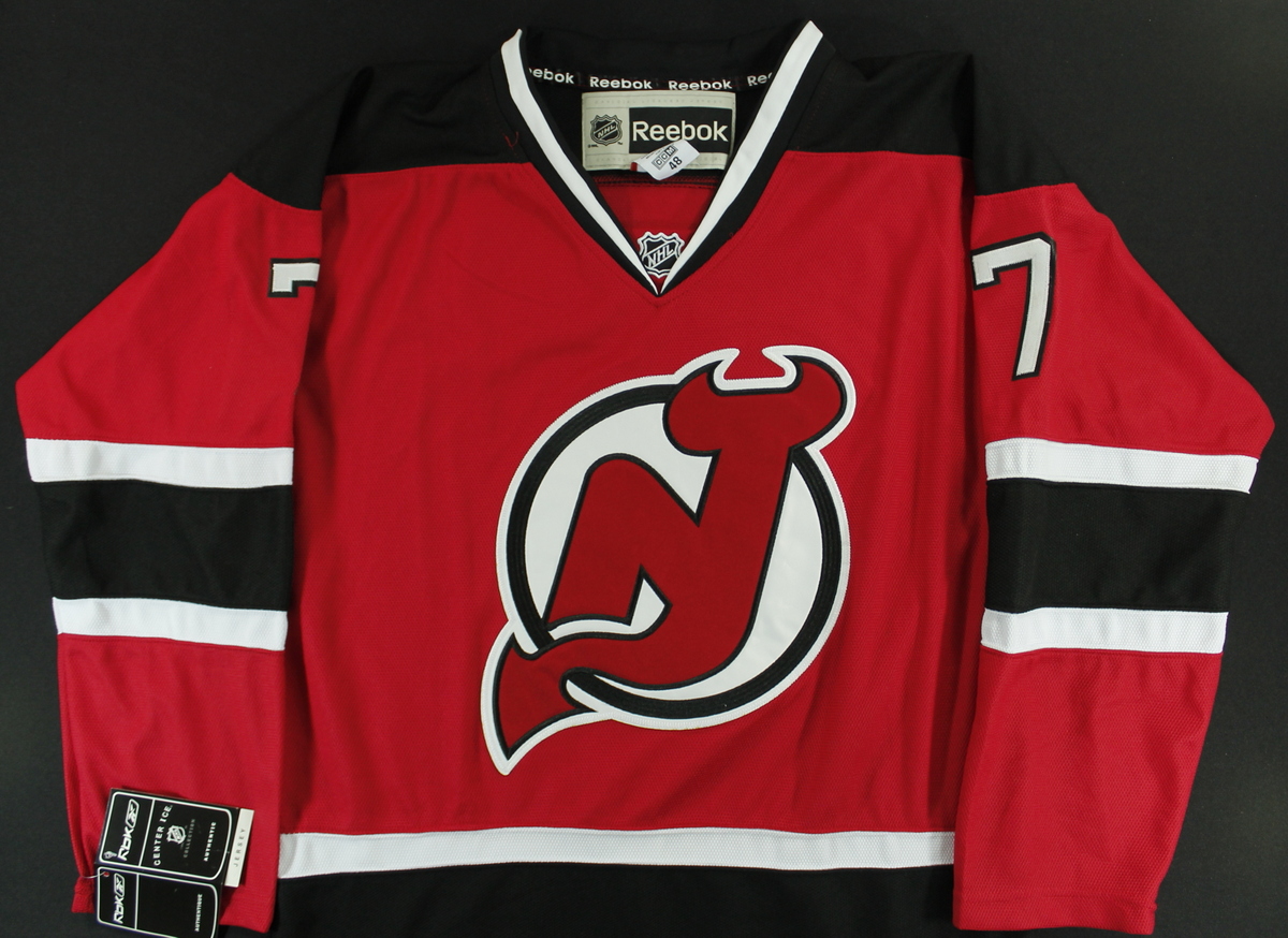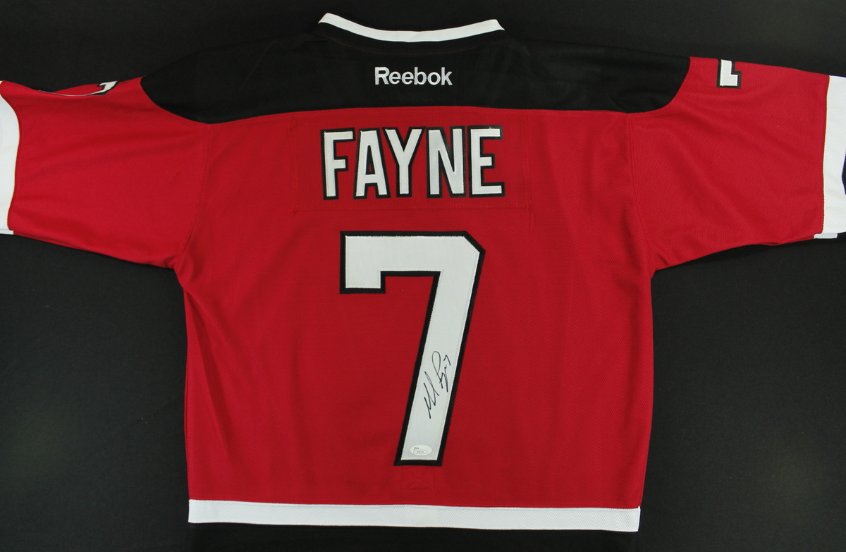 Reebok on-field style jersey. Everything is sewn on, size 48. Hand-signed in black felt-tip pen by Mark Fayne (New Jersey Devils). The autograph includes an official James Spence Authentication (JSA) hologram and matching COA for authenticity purposes.