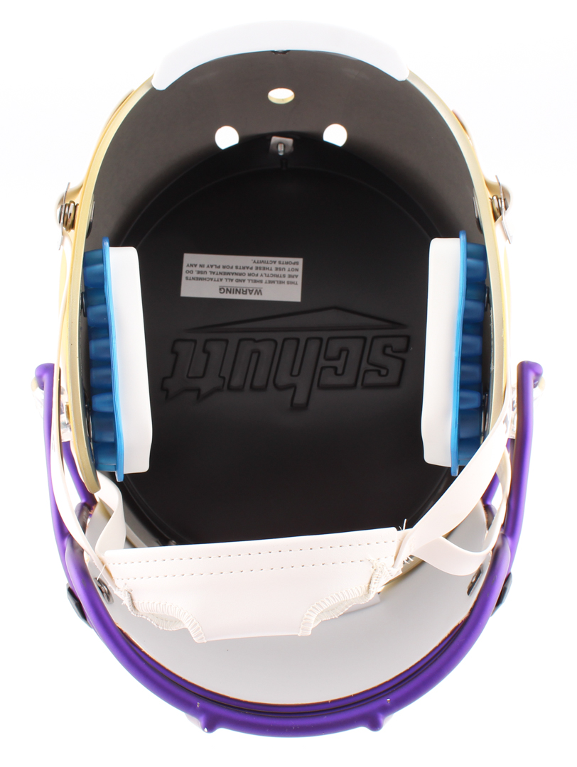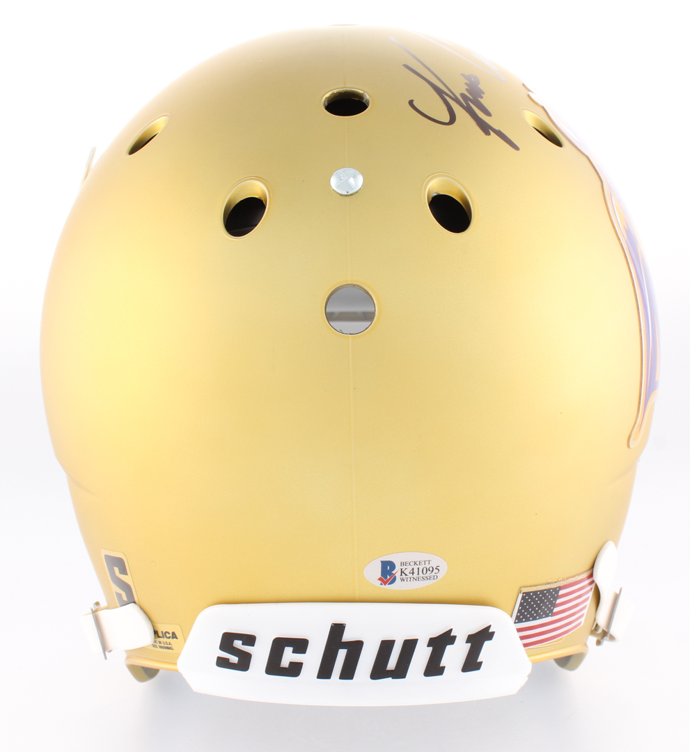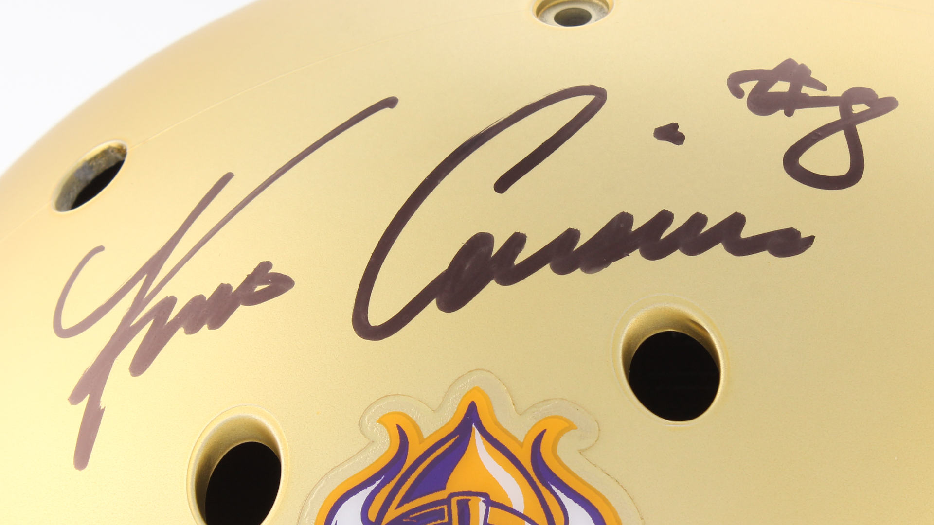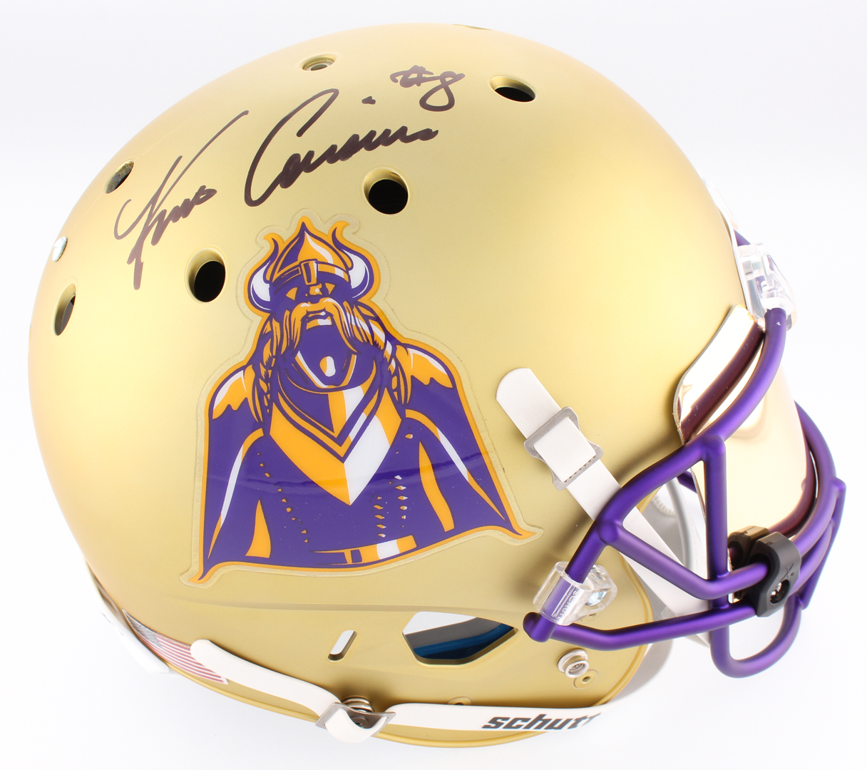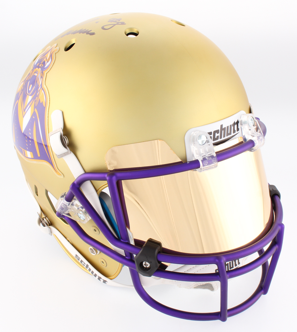Schutt Minnesota Vikings full-size custom satin gold replica helmet has been hand-signed in black felt-tip pen by Kirk Cousins. Please note, the helmet does not have a logo on the side opposite the autograph.
