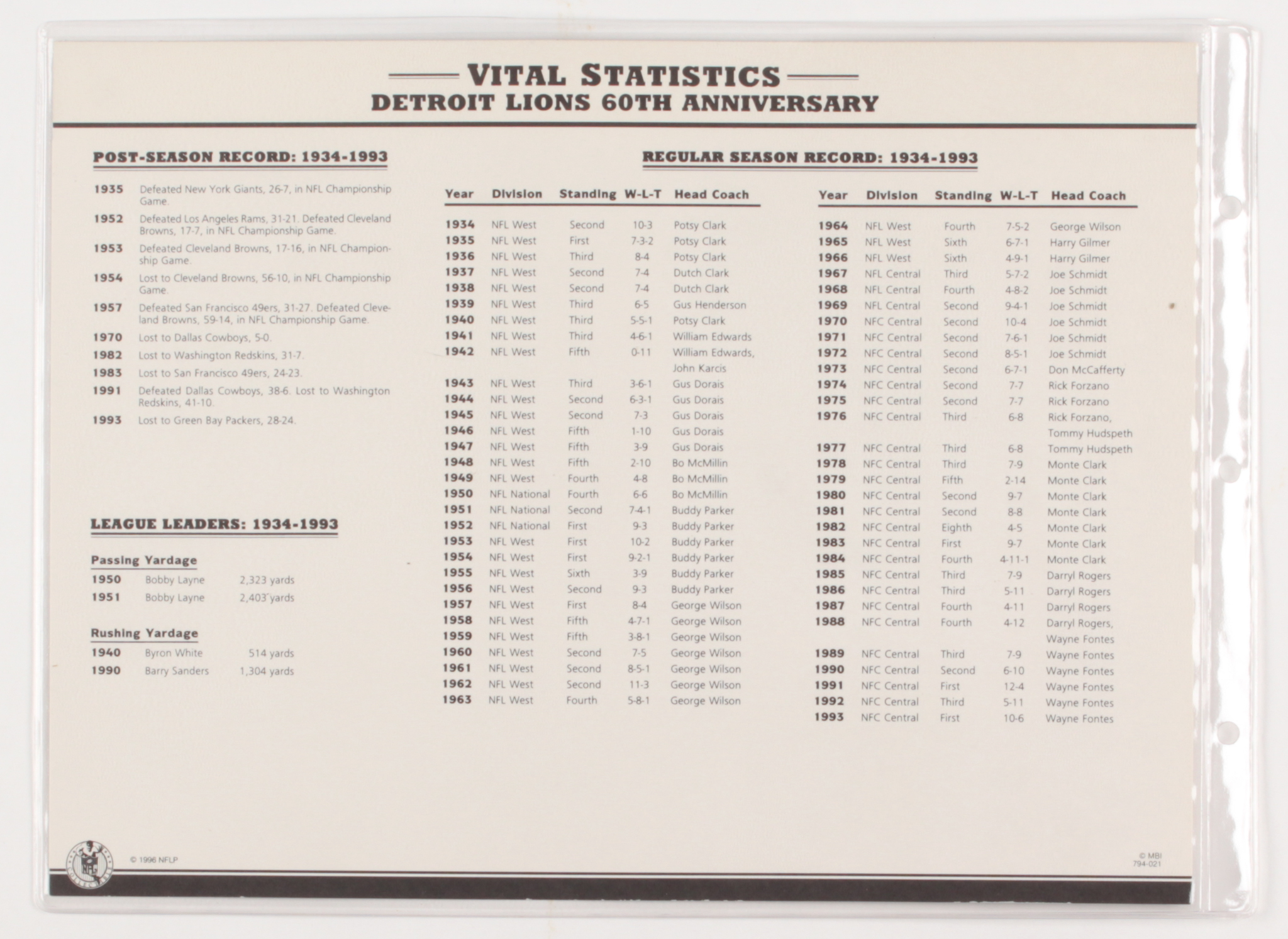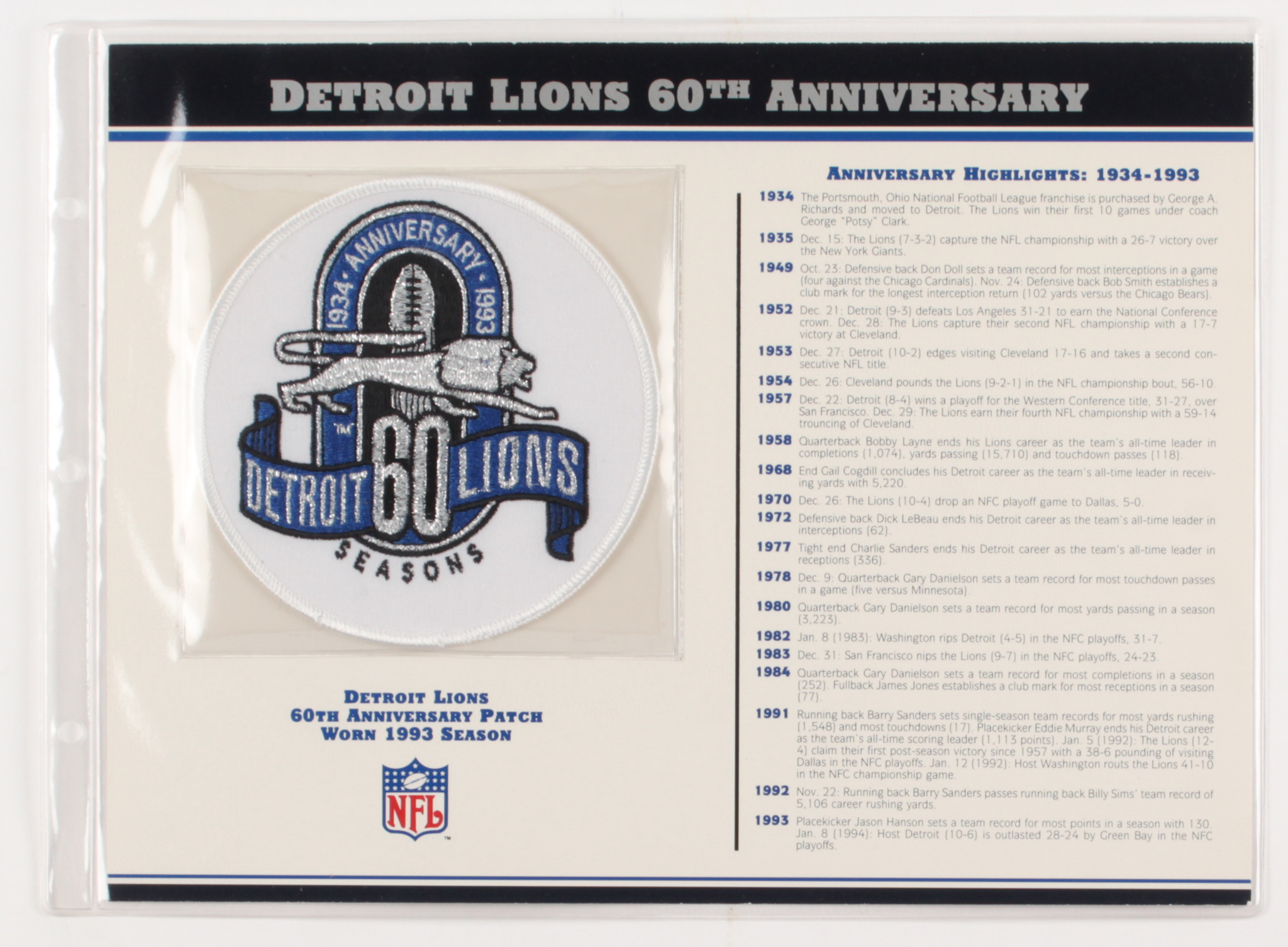 Detroit Lions 60th Anniversary Patch with 12" x 9" Statistic Card.