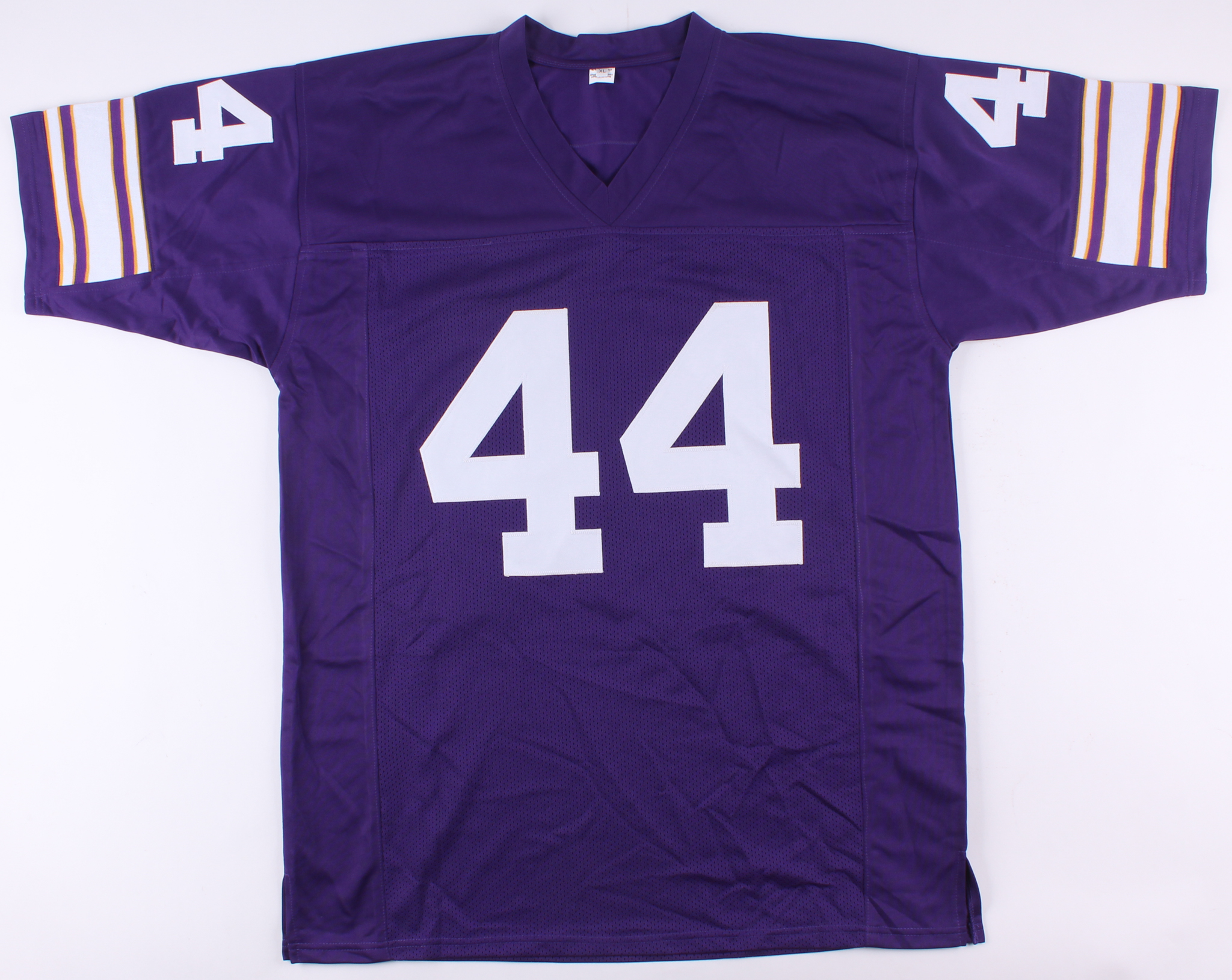 Custom on-field style jersey. Everything sewn on, size XL. Hand-signed in black felt-tip pen by Chuck Foreman.