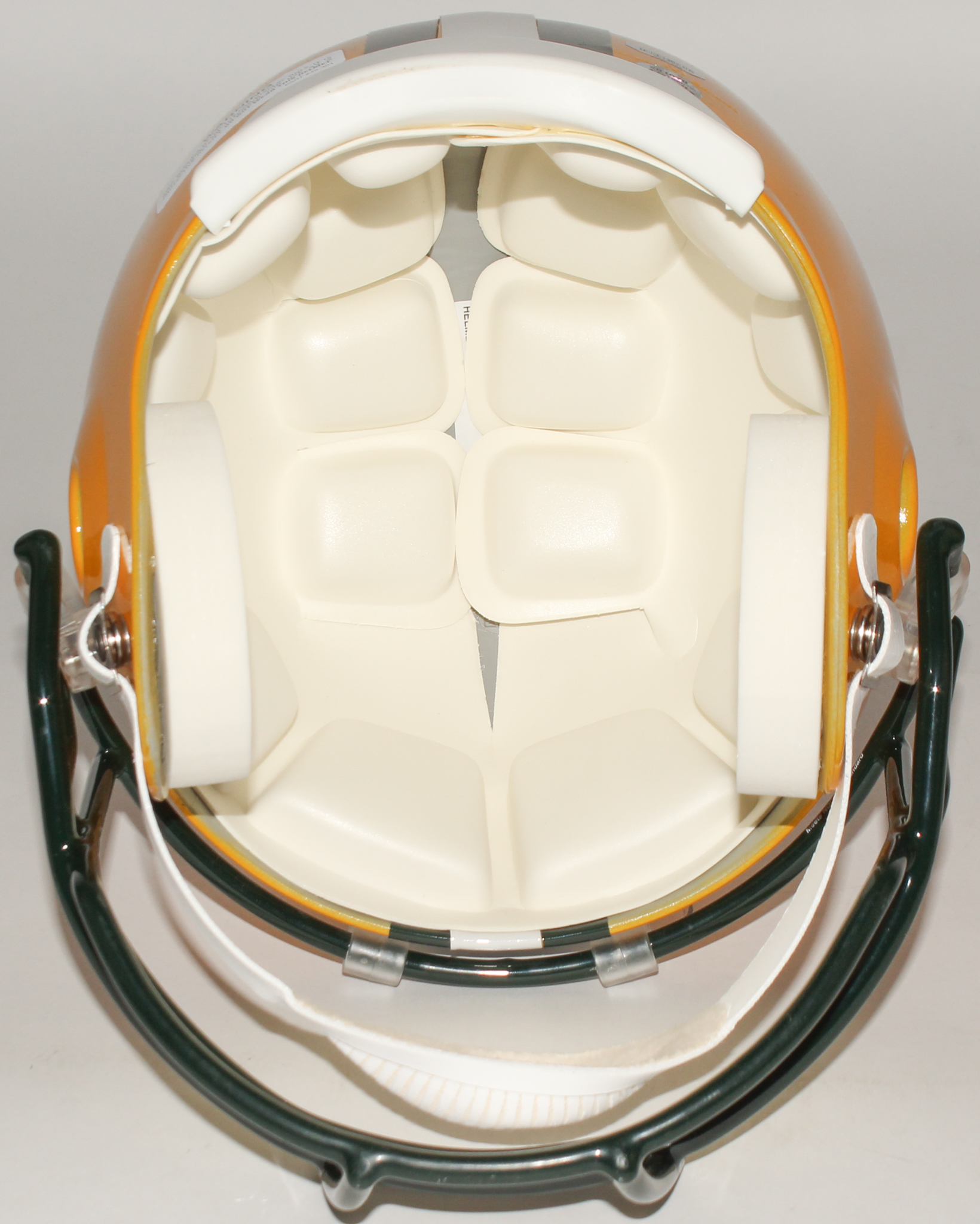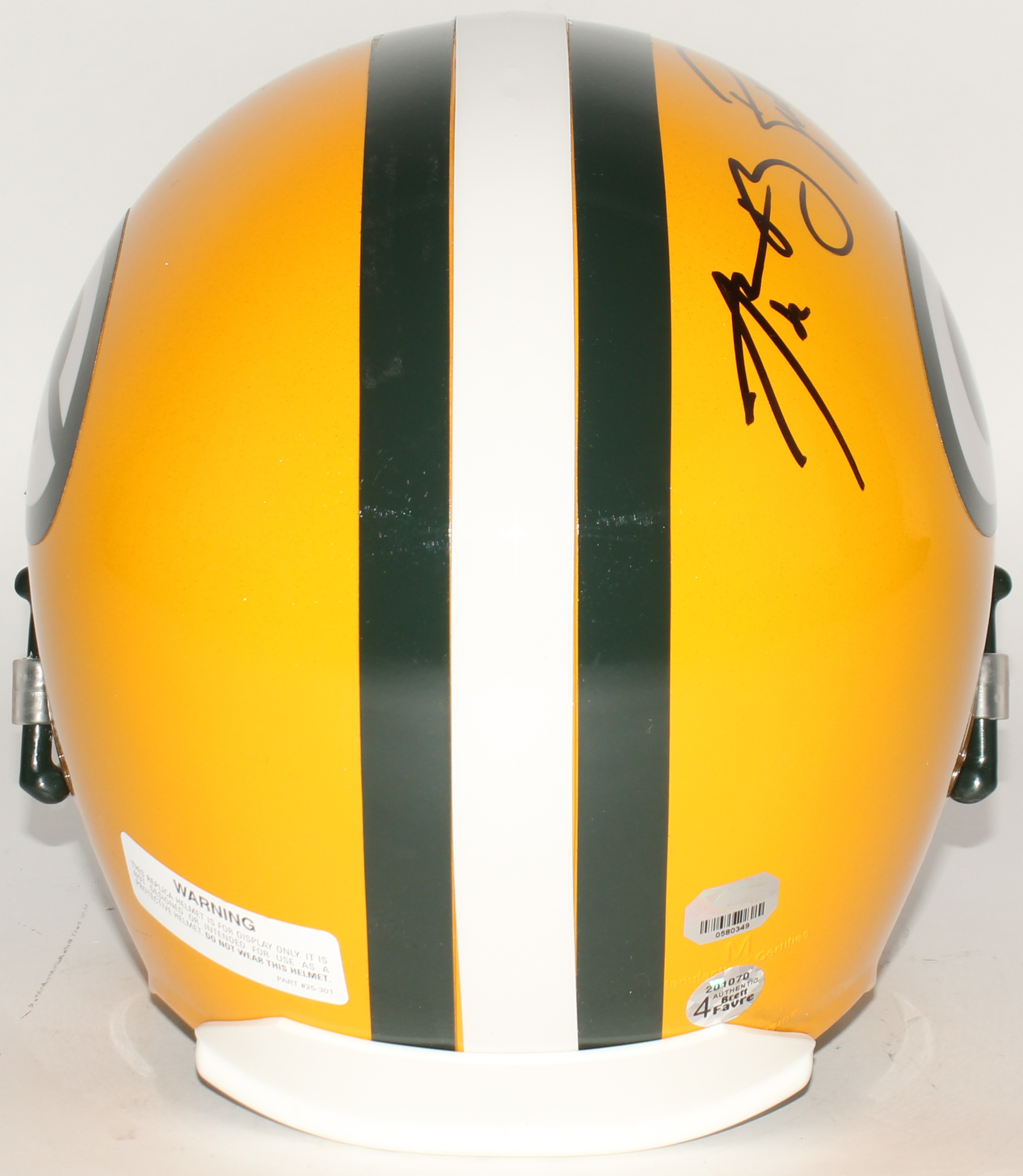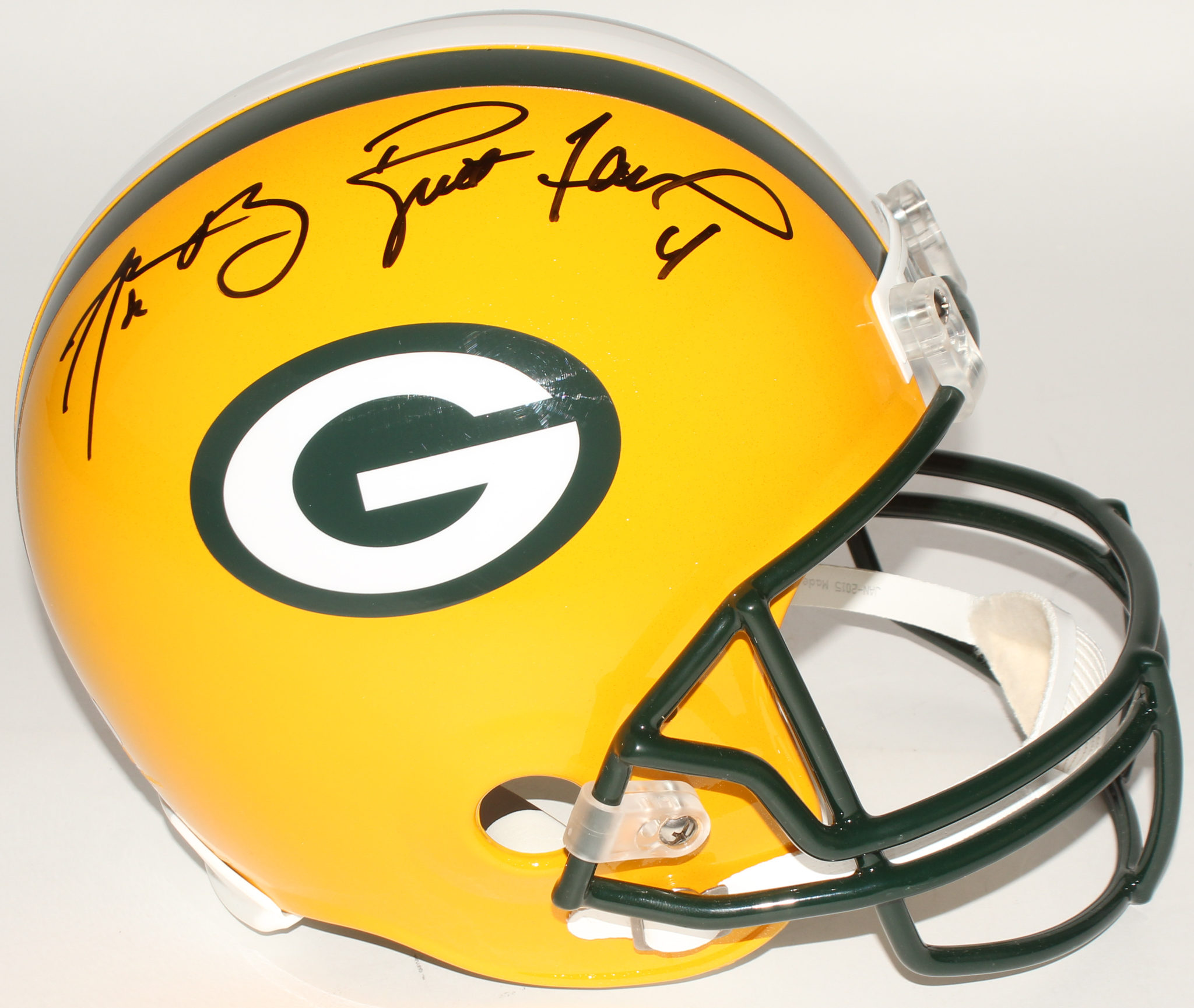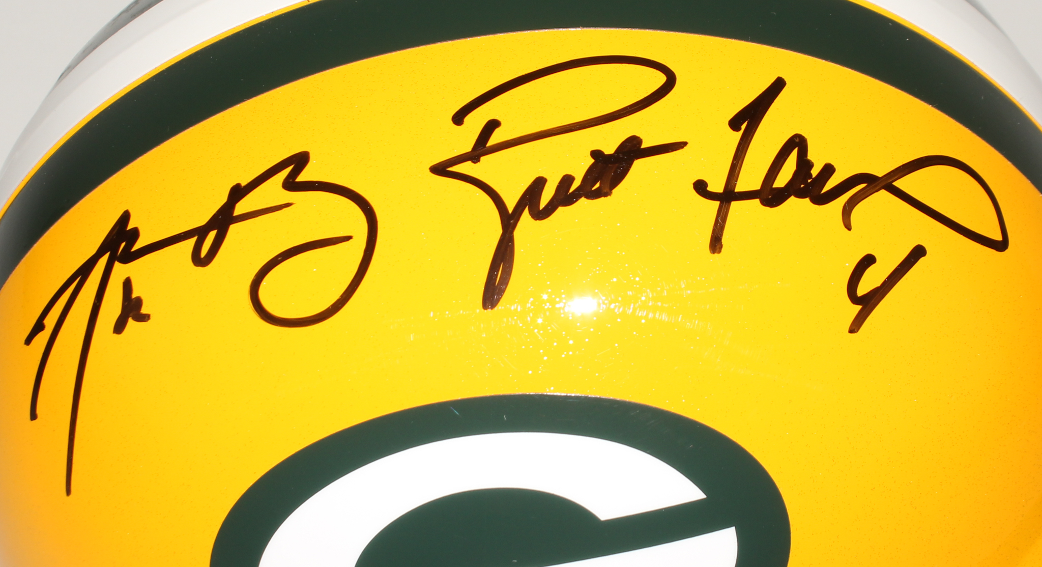 Riddell Green Bay Packers full size replica helmet. Hand-signed in black felt-tip pen by Aaron Rodgers and Brett Favre (HOF).