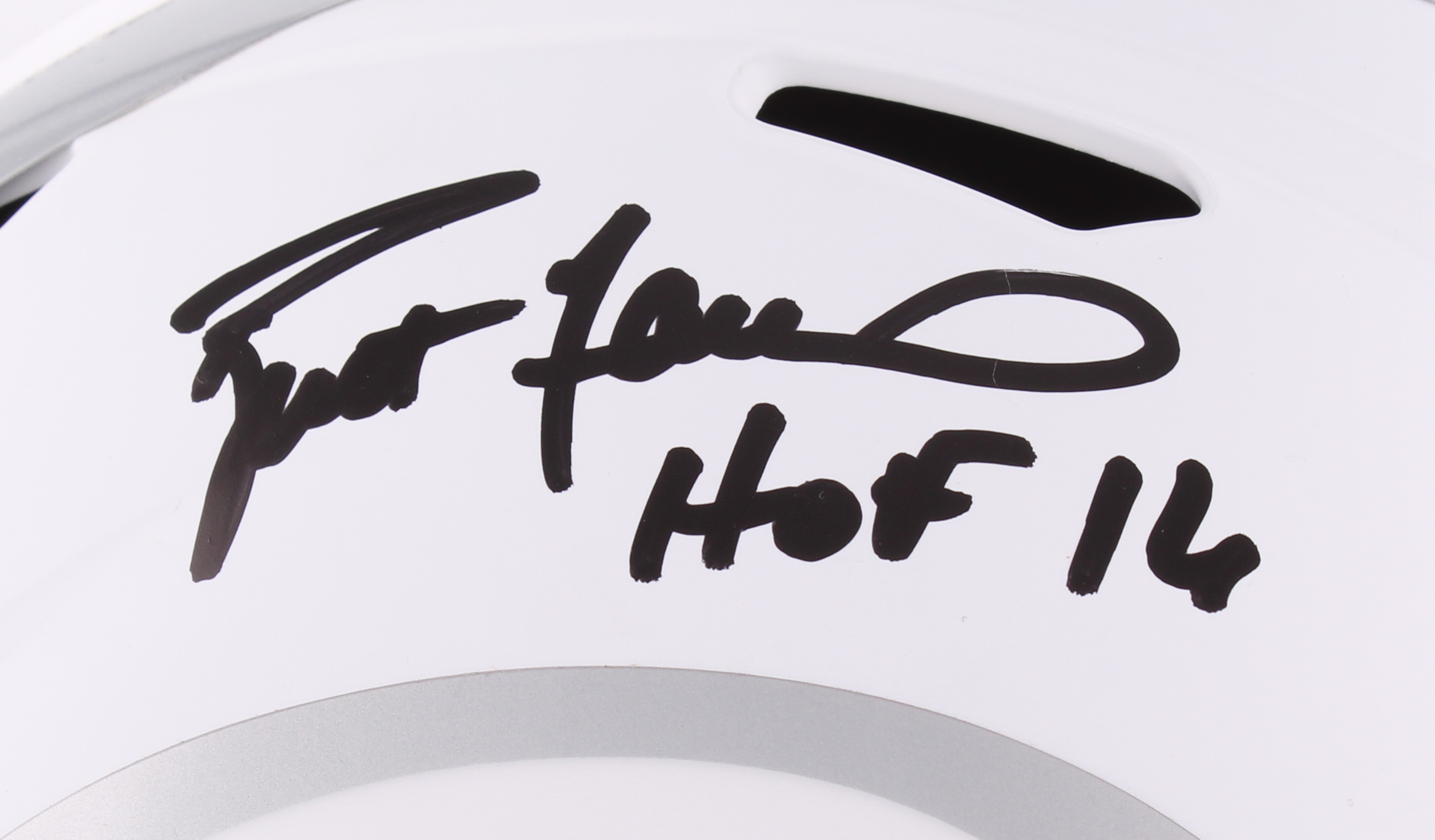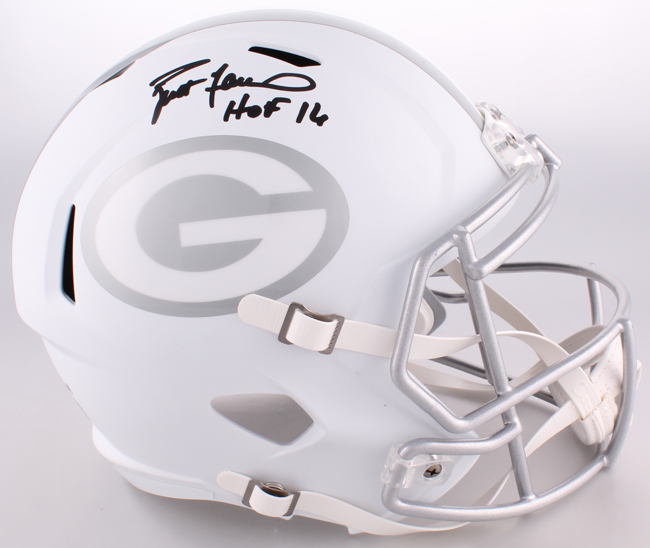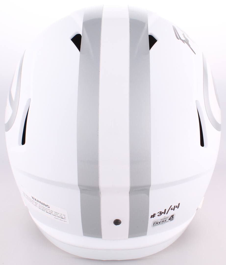 Riddelll Green Bay Packers full-size White ICE replica helmet. Hand-signed in black felt-tip pen by Brett Favre (HOF). Helmet has been hand-signed limited edition #34/44.