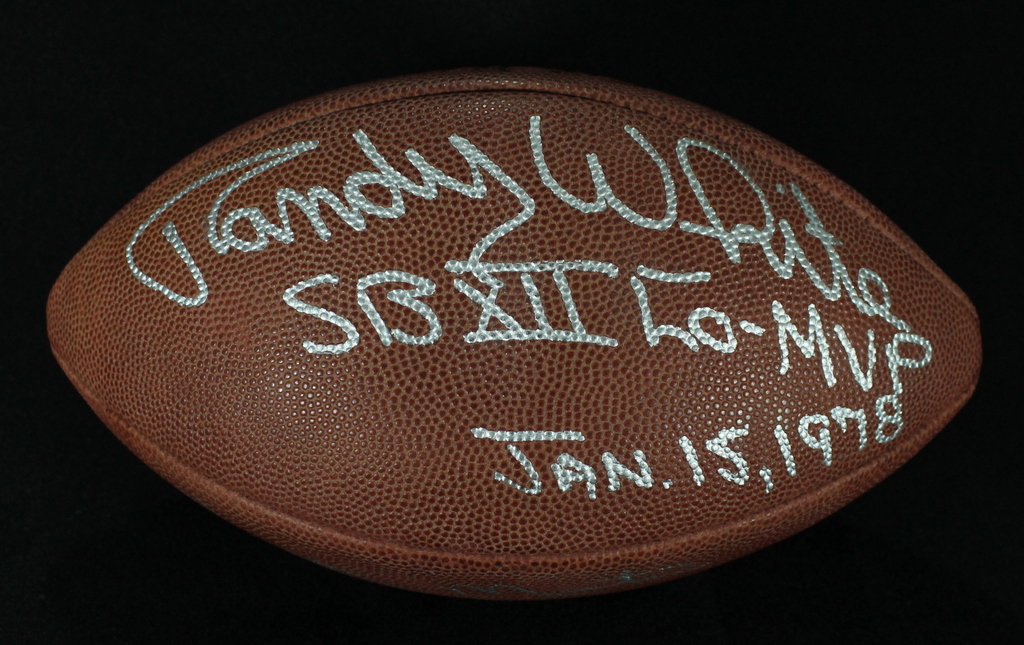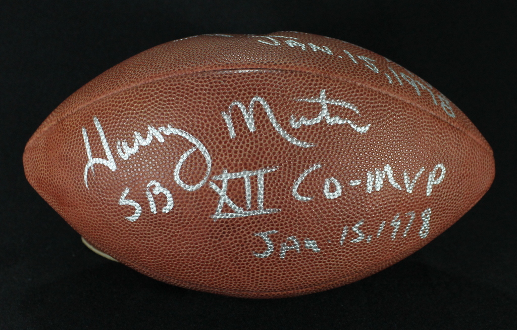 Official NFL Game football hand-signed by both MVP's from Super Bowl XII. Autographs include Randy White & Harvey Martin. Please note, the football holds it's shape for display but leaks air. The autographs include a James Spence Authentication (JSA) Auction House LOA for authenticity purposes.