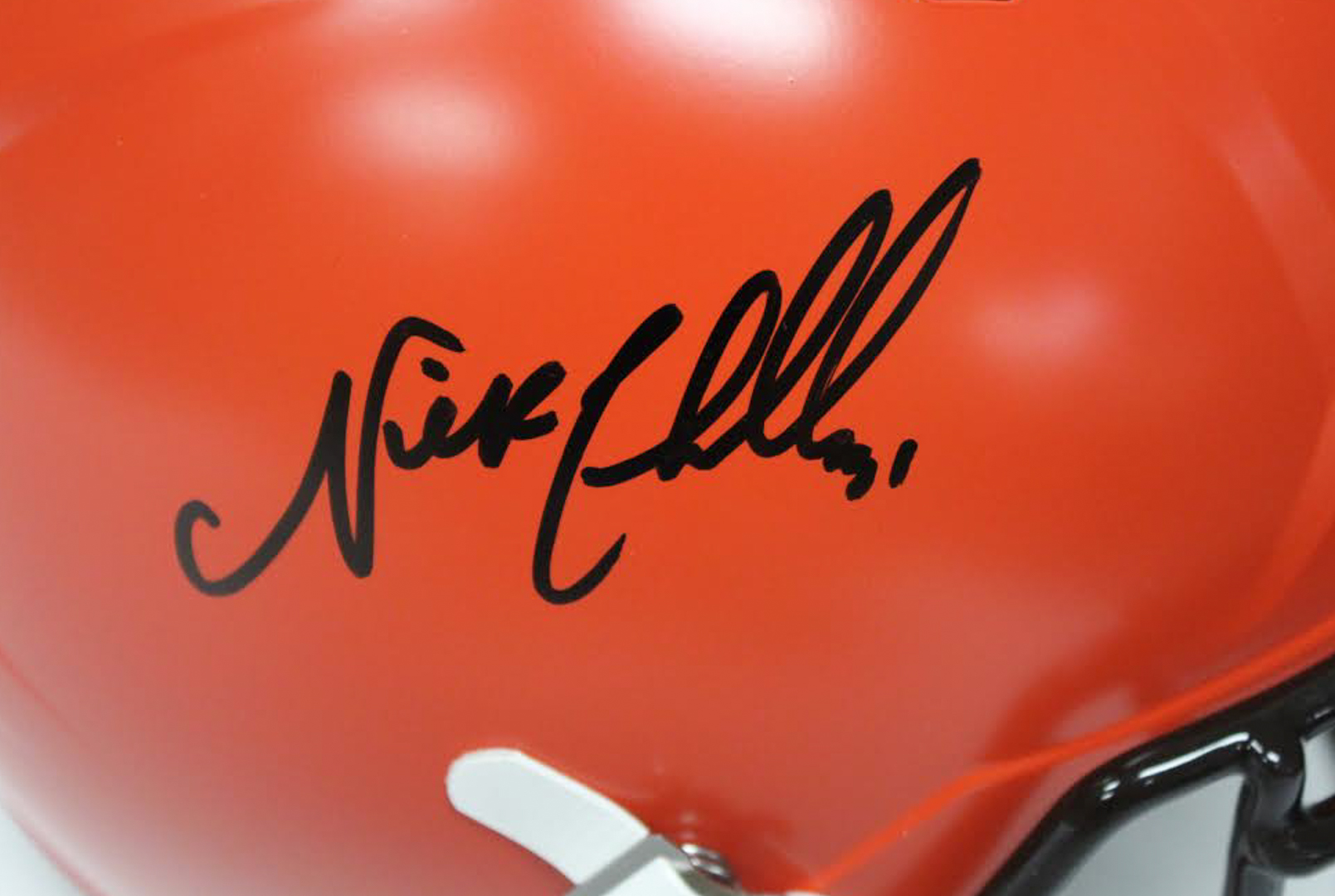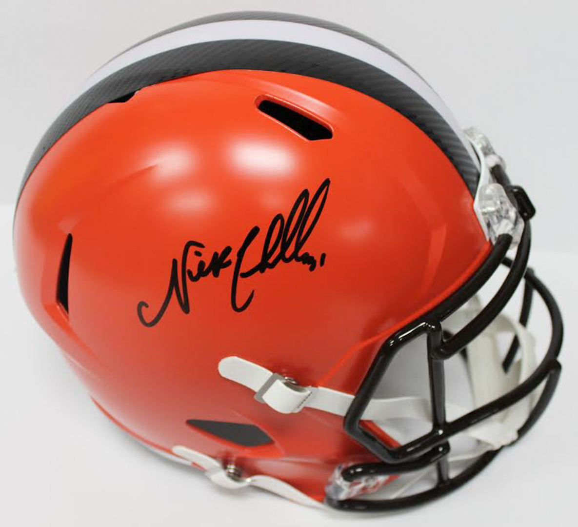 Cleveland Browns full-size replica speed helmet has been hand-signed in black felt-tip pen by Nick Chubb.